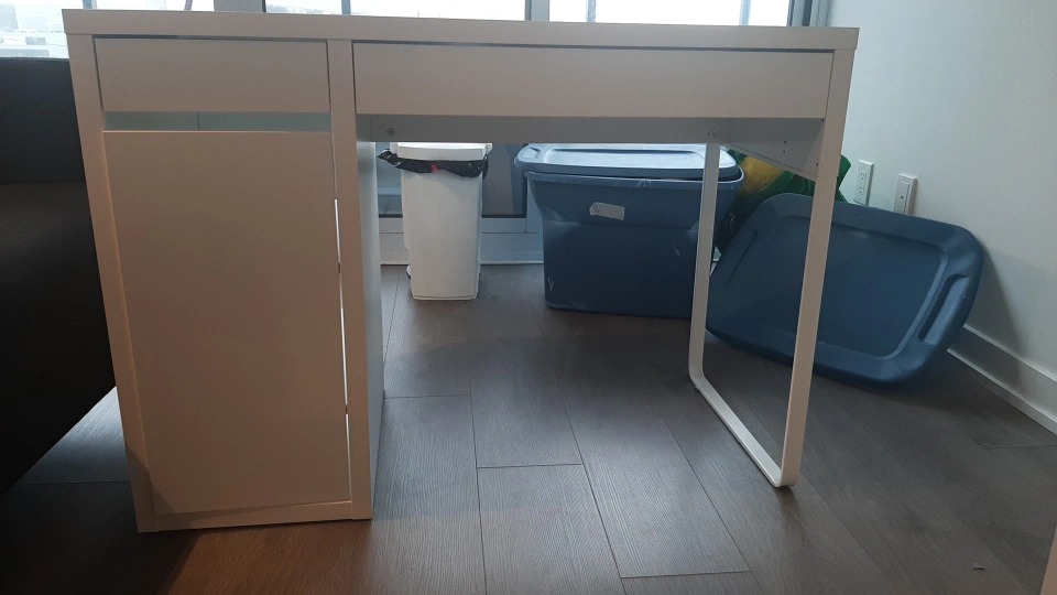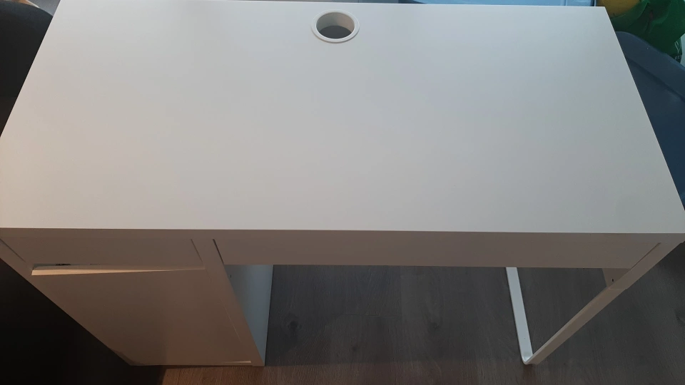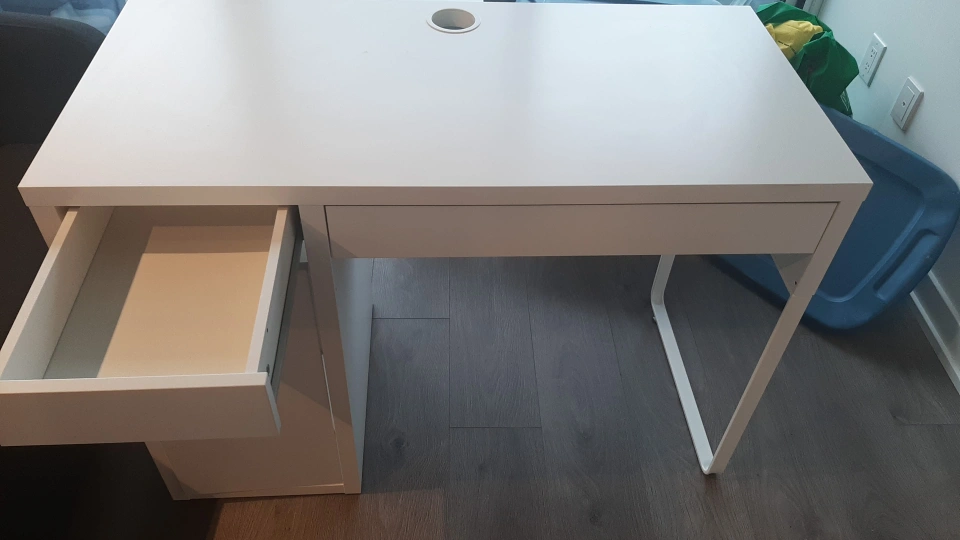 White desk with a drawer and a cabinet door. Includes a cable hole. Good condition purchased February of this year 110$