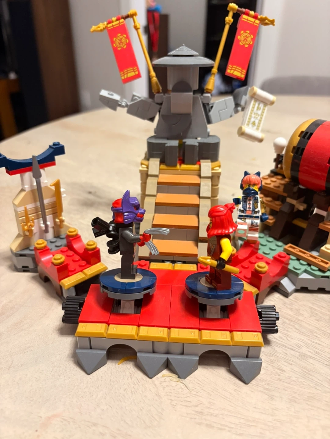 LEGO Ninjago Temple Duel set with multiple minifigures and accessories. Includes several colourful brick builds and play features for action-packed fun! This set is perfect for young Ninjago fans to recreate exciting battles.