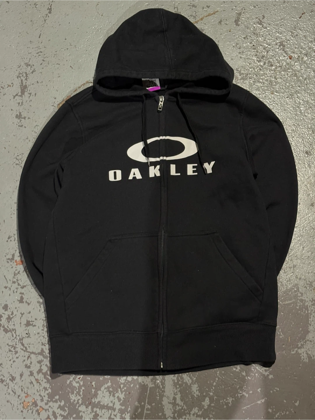Oakley zip-up hoodie in black with a white logo graphic. It's made of a soft cotton blend for comfort. This hoodie features a full zip closure and front pockets.