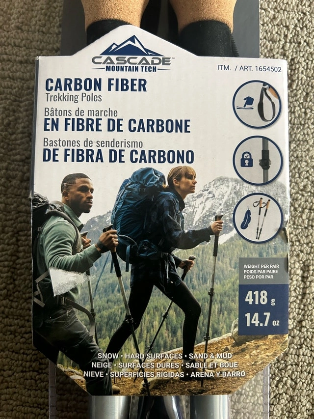 Brand new in pack! These Cascade Mountain Tech carbon fiber trekking poles are designed to provide exceptional support and stability for hiking, walking, and backpacking. Featuring lightweight carbon fiber construction, they offer a comfortable cork grip with moisture-wicking capabilities, adjustable height, and interchangeable tips for various terrains. Ready for any adventure, these poles are built to withstand pressure and decrease vibration, making your outdoor excursions more enjoyable!