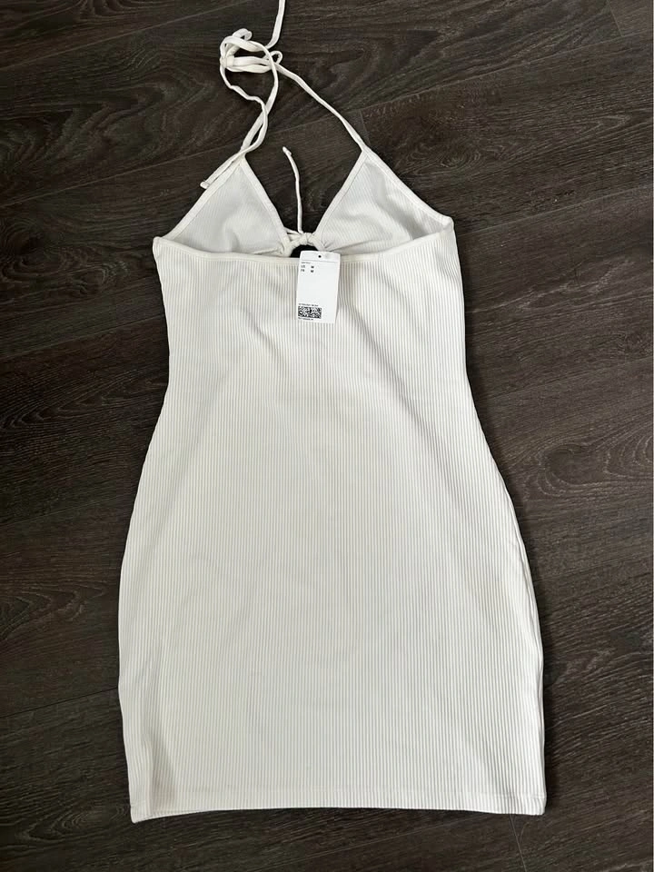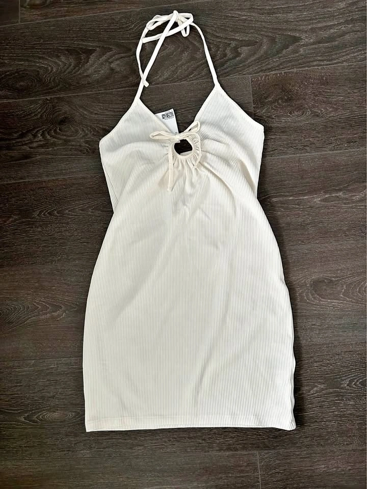 Cute ribbed halter neck mini dress with a tie front detail and circular cutout. Great for warm weather. Dress is size M. Pet and smoke free home. Located near Yonge and High Tech Road in Oakville.