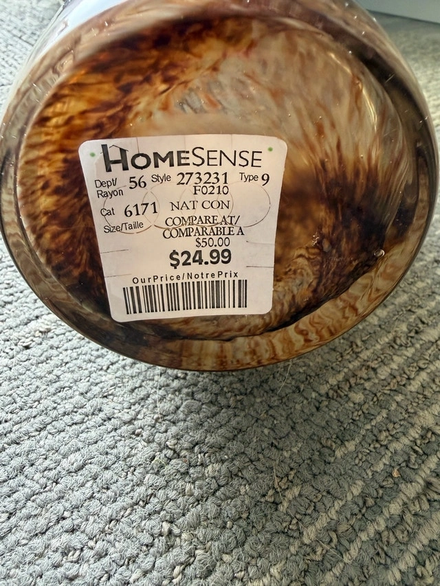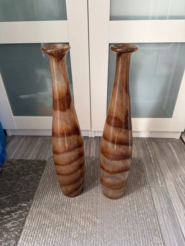 Clear with brown speckled spiral pattern, 21.5”h. These vases were used once for home staging, but I haven’t used them since. They were from HomeSense for $24.99 each.