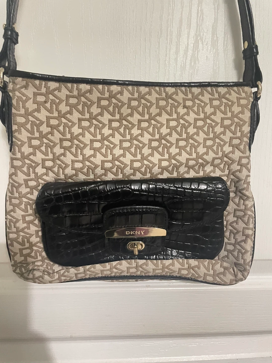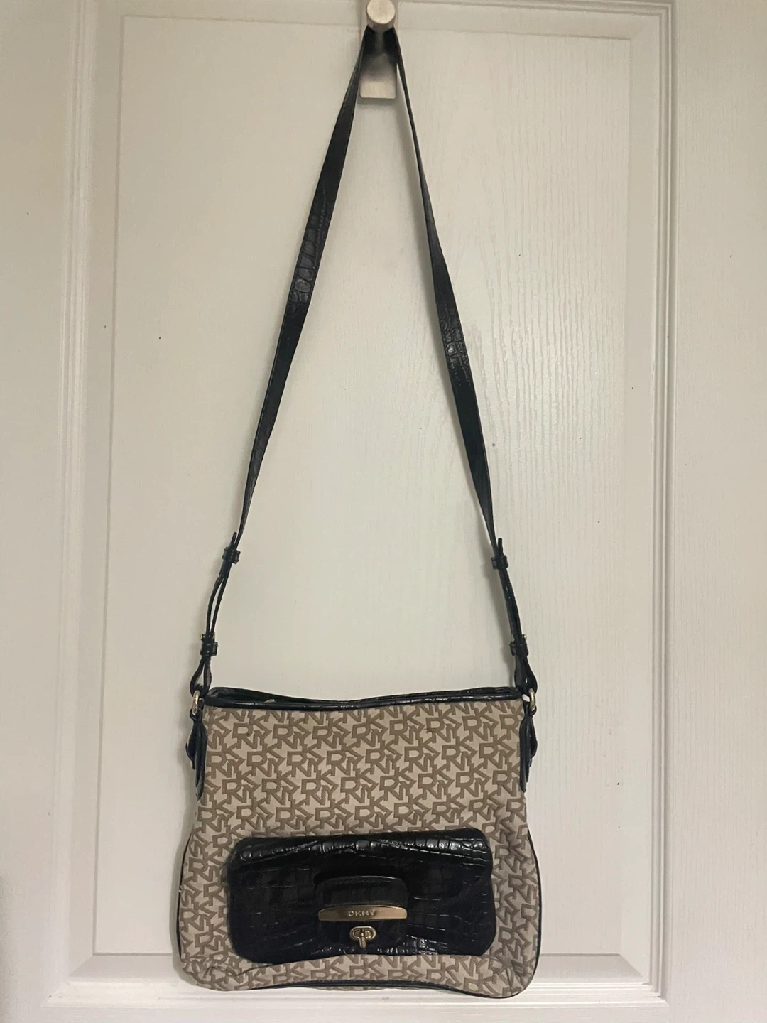 This DKNY crossbody bag features the signature all-over logo print. It has a black textured flap closure with a gold-tone buckle detail. The adjustable strap is black.
