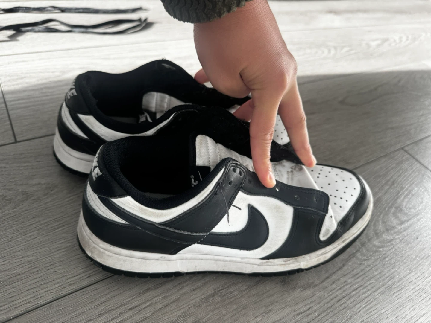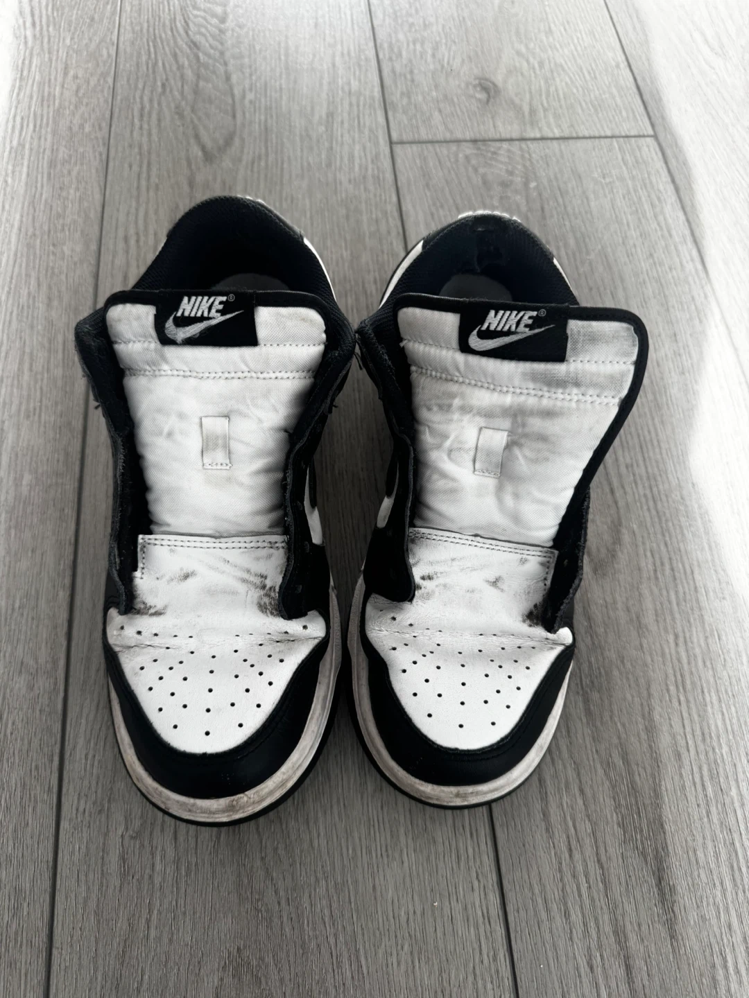 Selling a pair of Nike Dunk Low Panda shoes in US size 8.5. They are black and white. There are a couple of signs of wear, but overall they are in good condition.