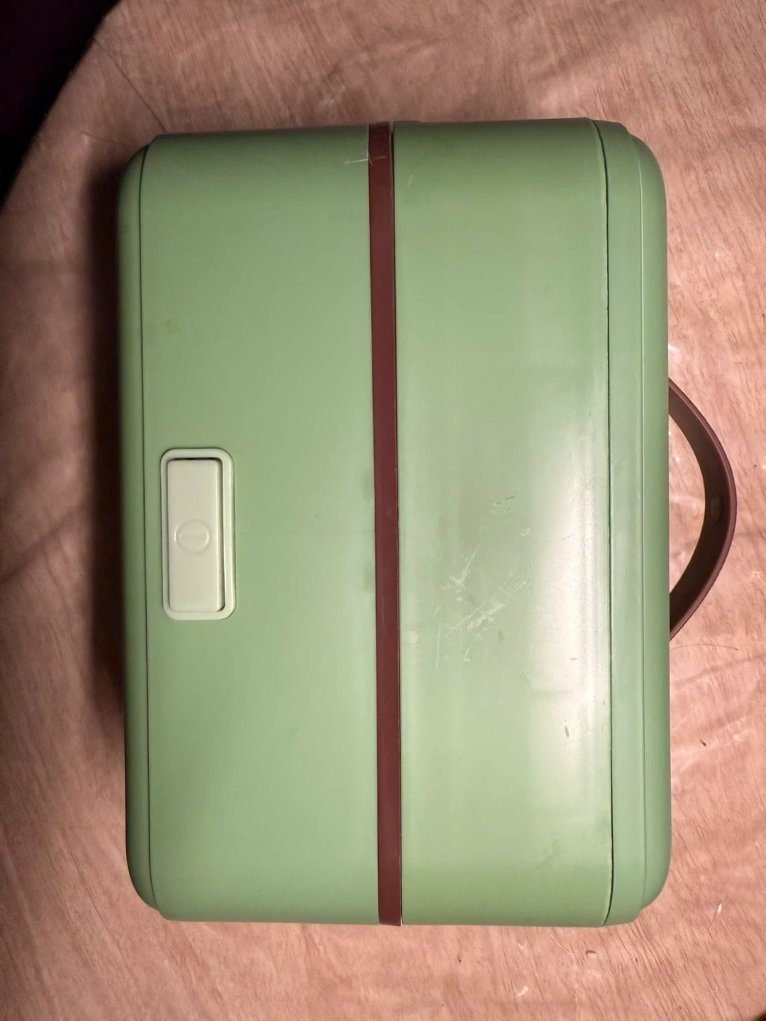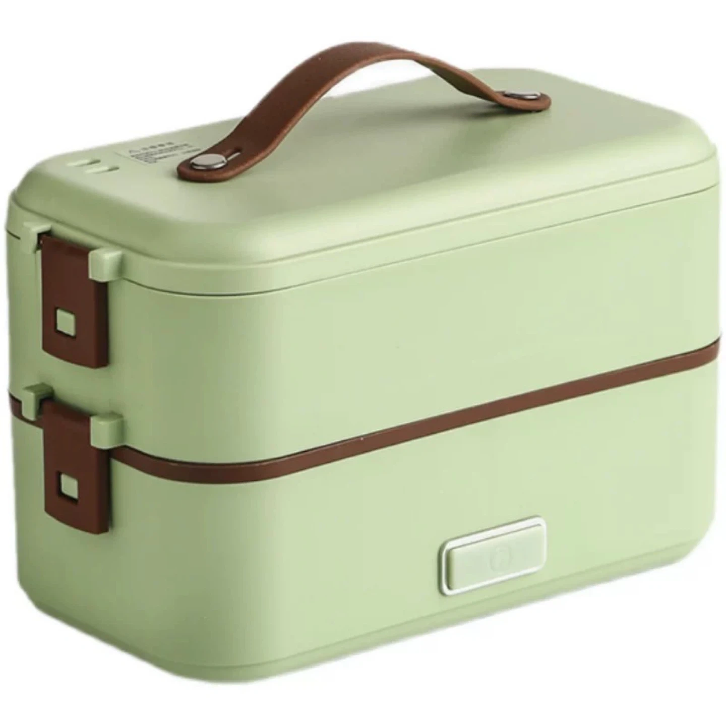 This is a two-tier electric lunch box with stainless steel containers. It comes with a power cord for heating food on the go. The interior compartments are made of stainless steel, and the exterior is a light green plastic with brown accents. A lid with a handle is also included for portability.