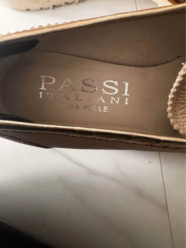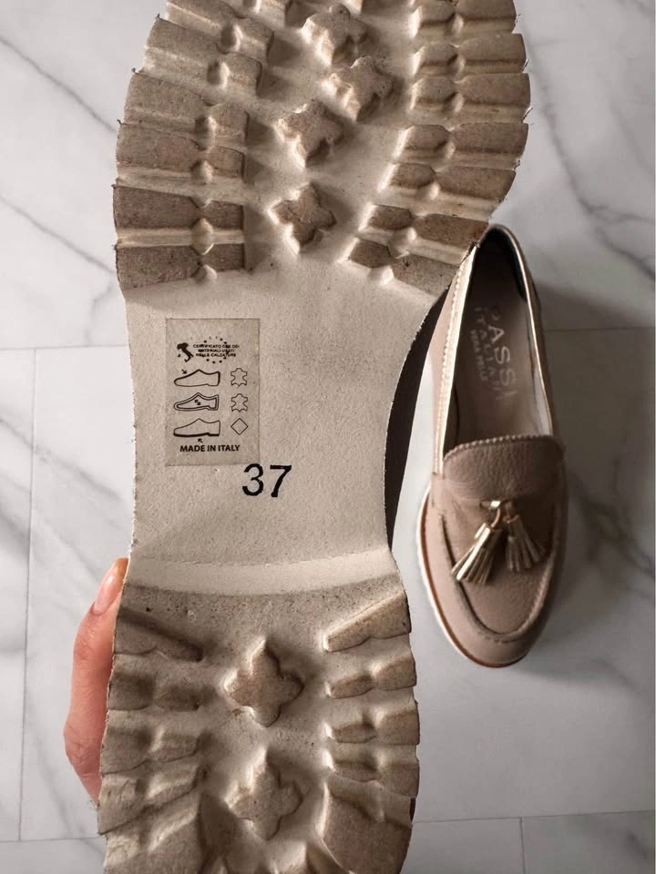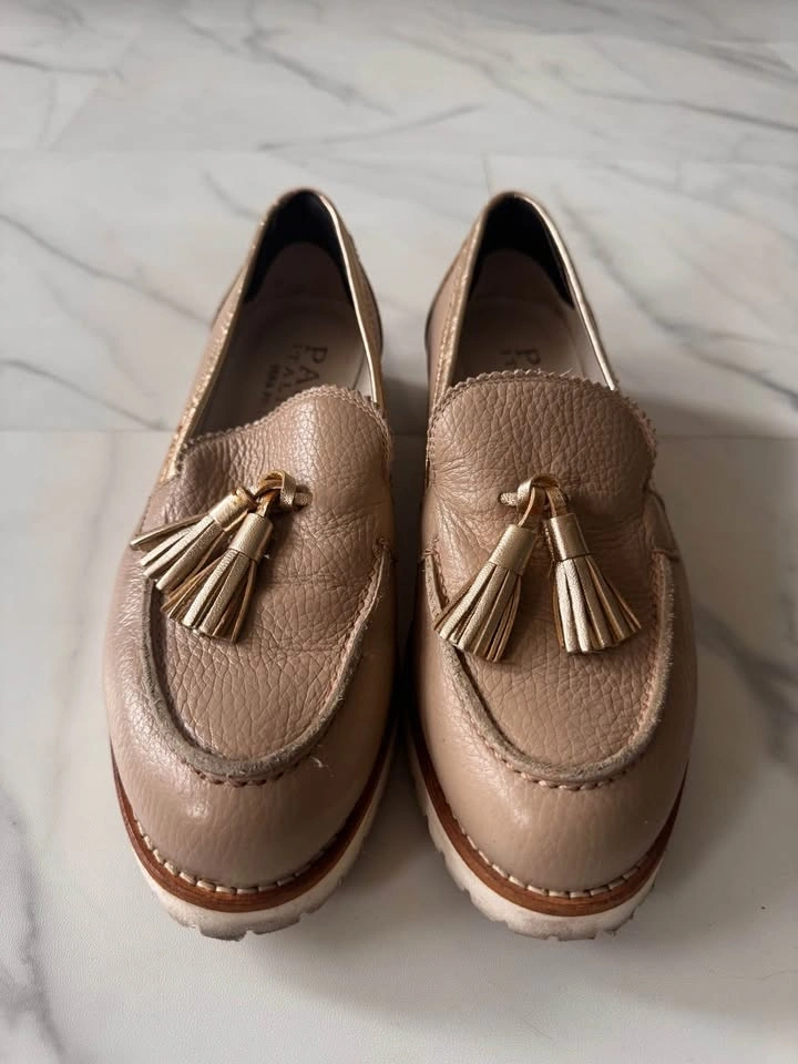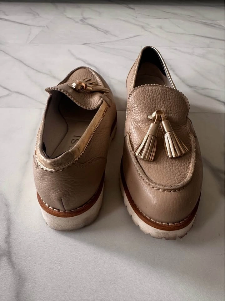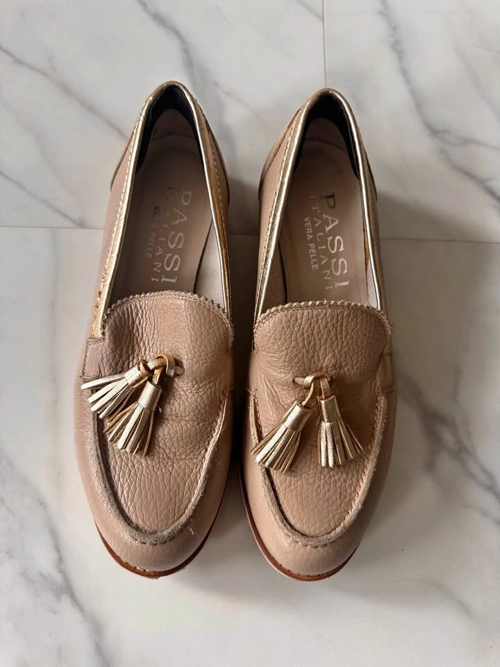 Elegant taupe leather loafers with decorative tassels. Gold-tone tassel hardware adds shine. Cushioned insole for everyday comfort. Versatile neutral for casual or dressy looks. Bought in Italy. Size EU 37.
