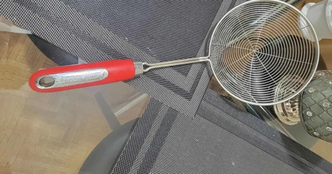This strainer is great for scooping food out of hot oil or water. It has a metal mesh head and a red handle for a comfortable grip. Perfect for frying or boiling tasks!