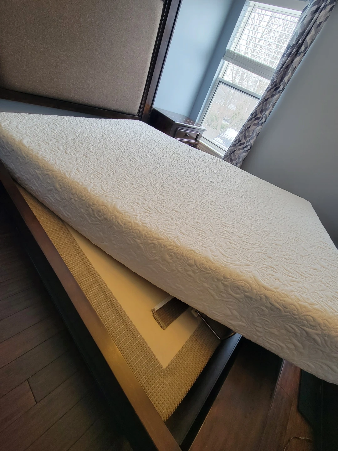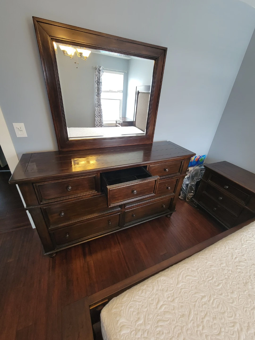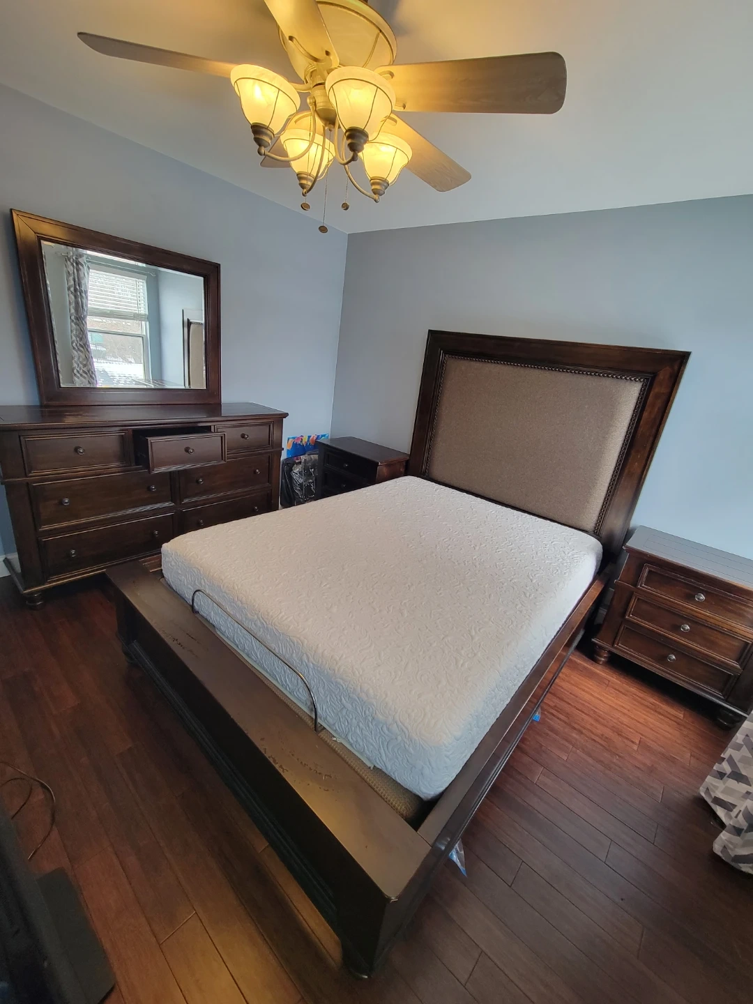 Complete dark wood bedroom set from Ashley including a queen-size bed frame with upholstered headboard, a dresser with mirror, and two matching nightstands. Serta mattress and adjustable base. All furniture pieces are made of solid dark wood with a rich finish. This set offers ample storage with multiple drawers in the dresser and nightstands. A classic and elegant addition to any bedroom!