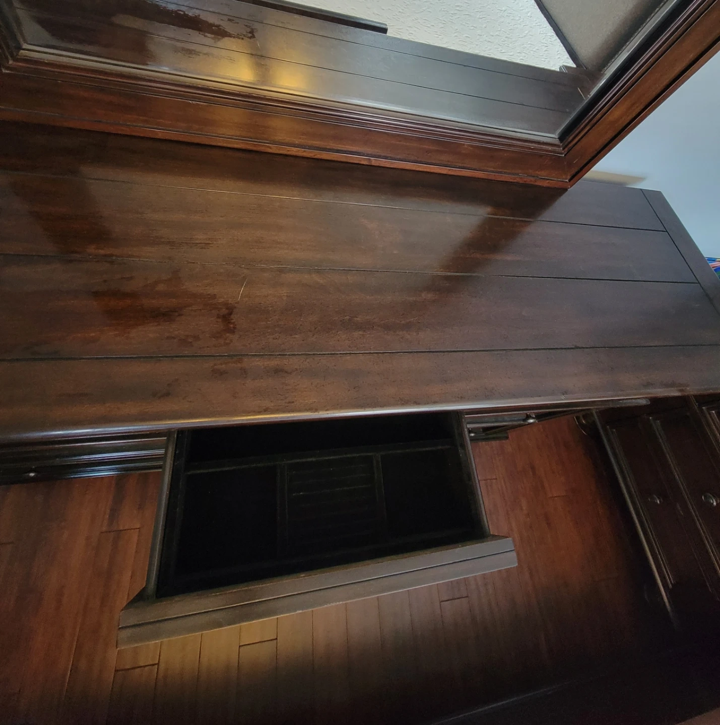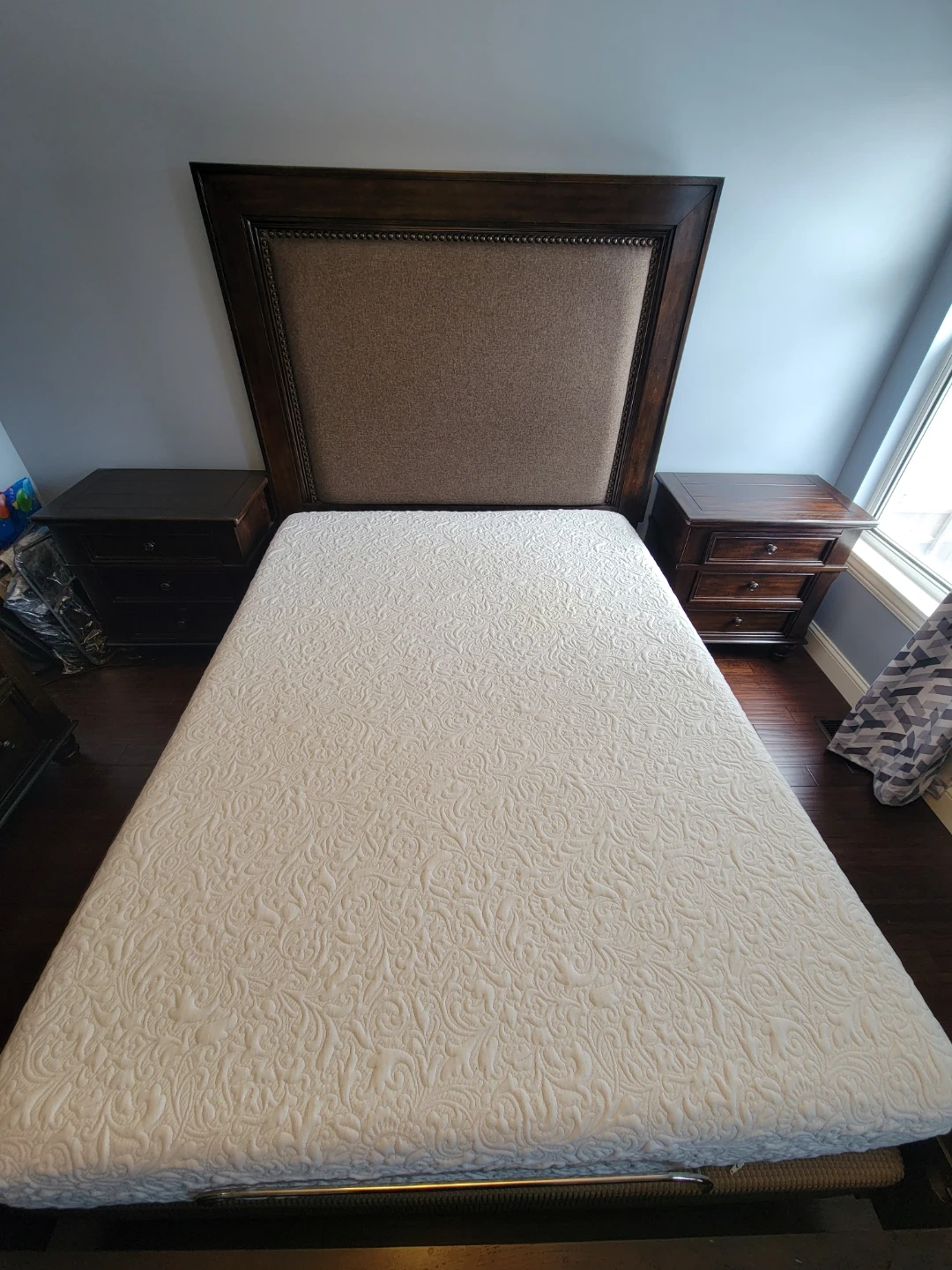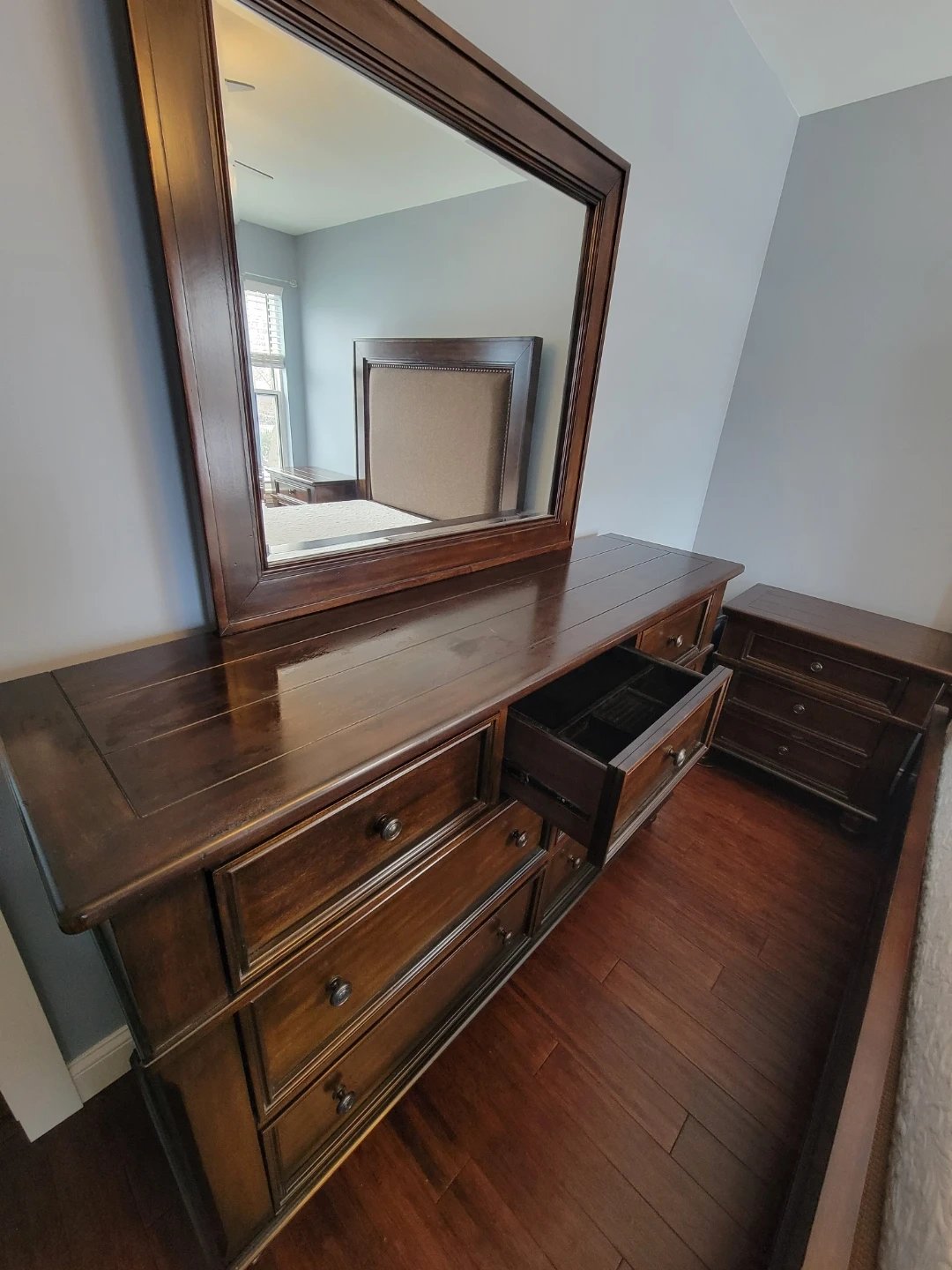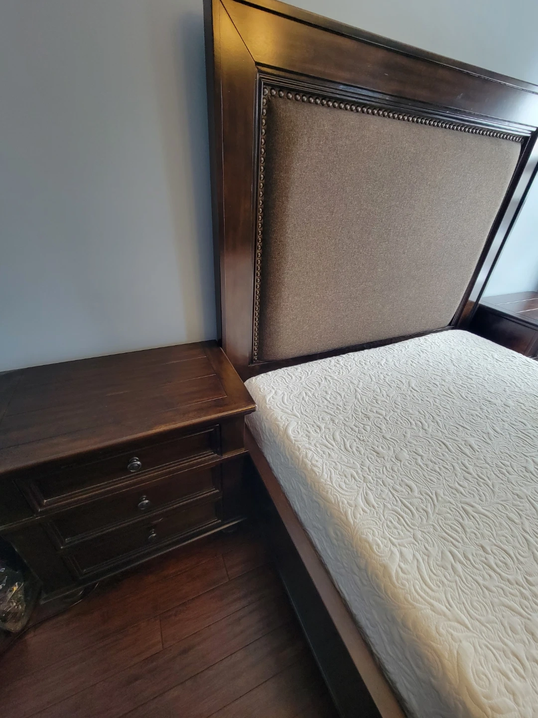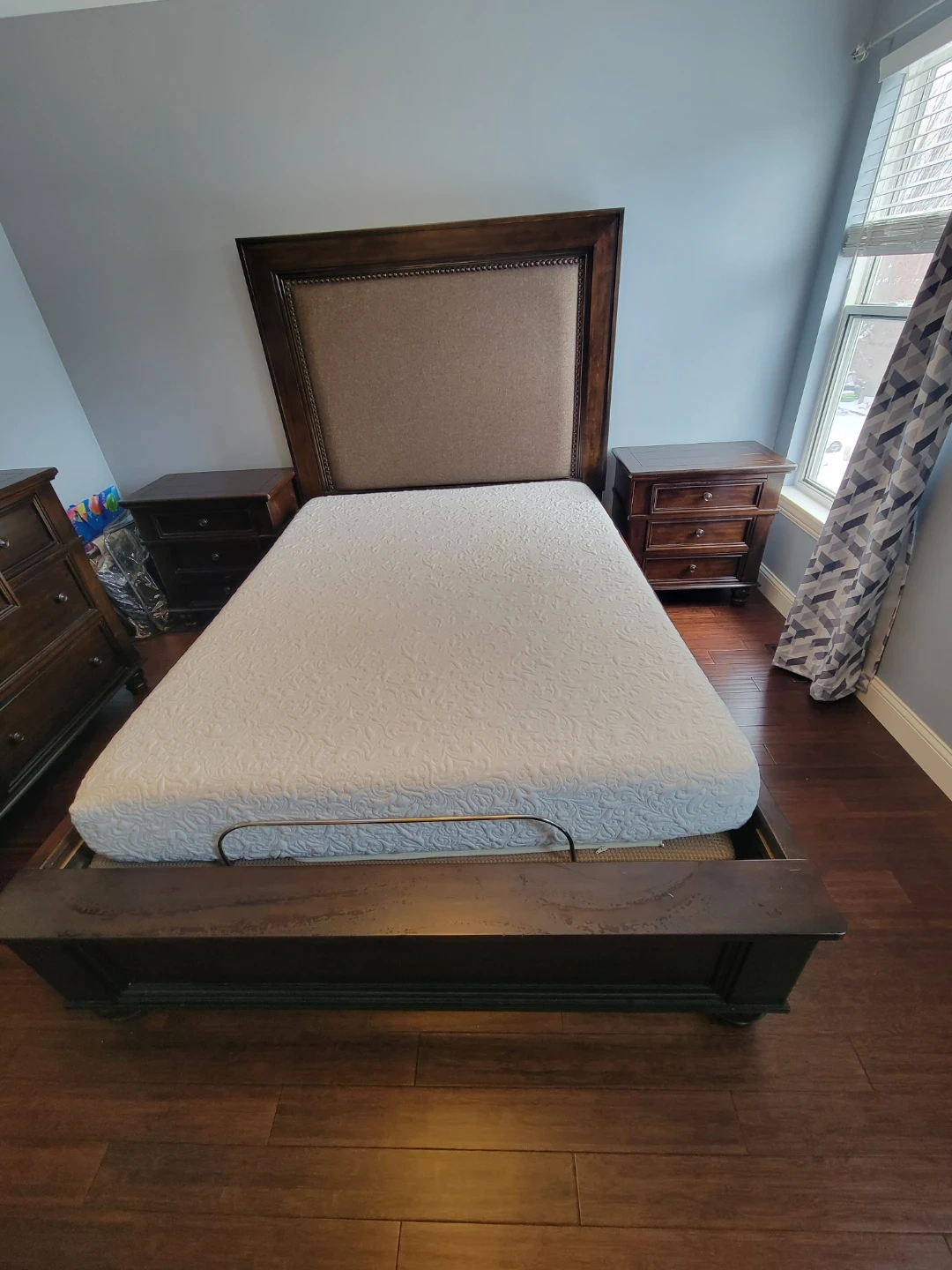 Complete dark wood bedroom set from Ashley including a queen-size bed frame with upholstered headboard, a dresser with mirror, and two matching nightstands. Serta mattress and adjustable base. All furniture pieces are made of solid dark wood with a rich finish. This set offers ample storage with multiple drawers in the dresser and nightstands. A classic and elegant addition to any bedroom!