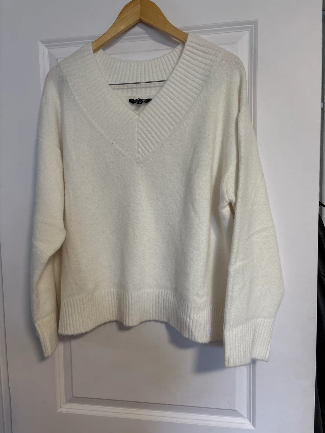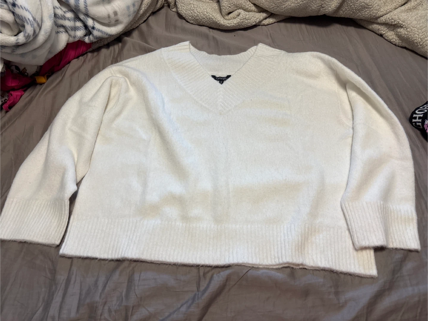 Cozy white V-neck sweater from George. It's a size XL/TG. Made with a soft, fuzzy knit material. Brand New never worn. Bought has gift cannot return. Purchased for 24.98 plus tax.