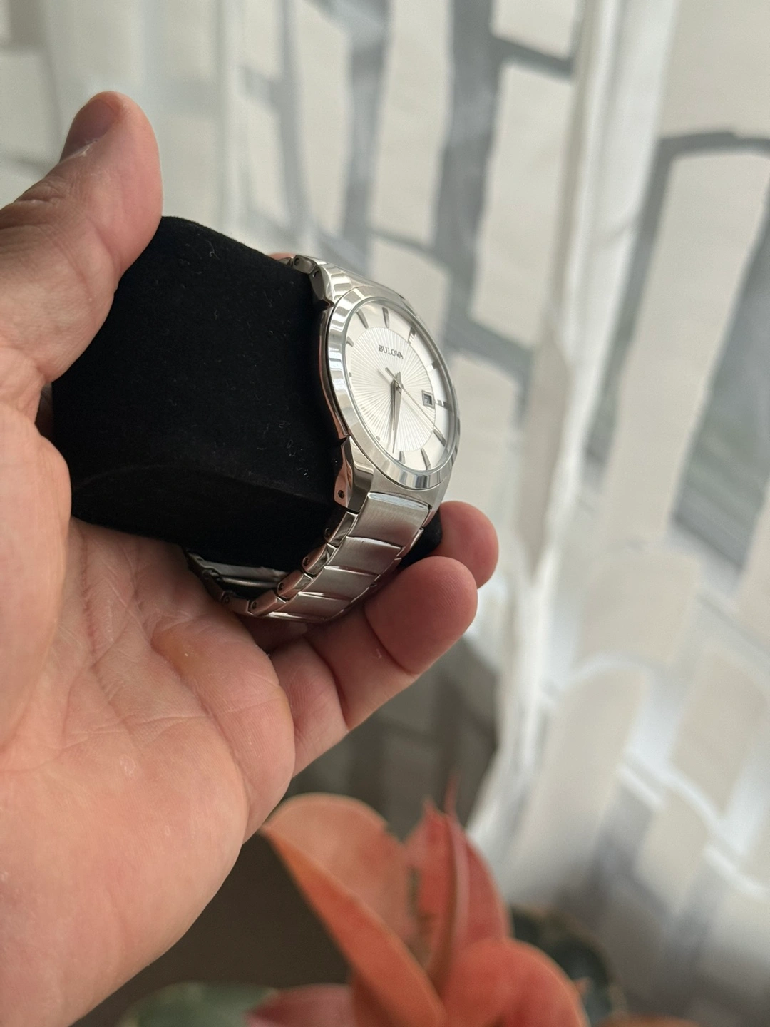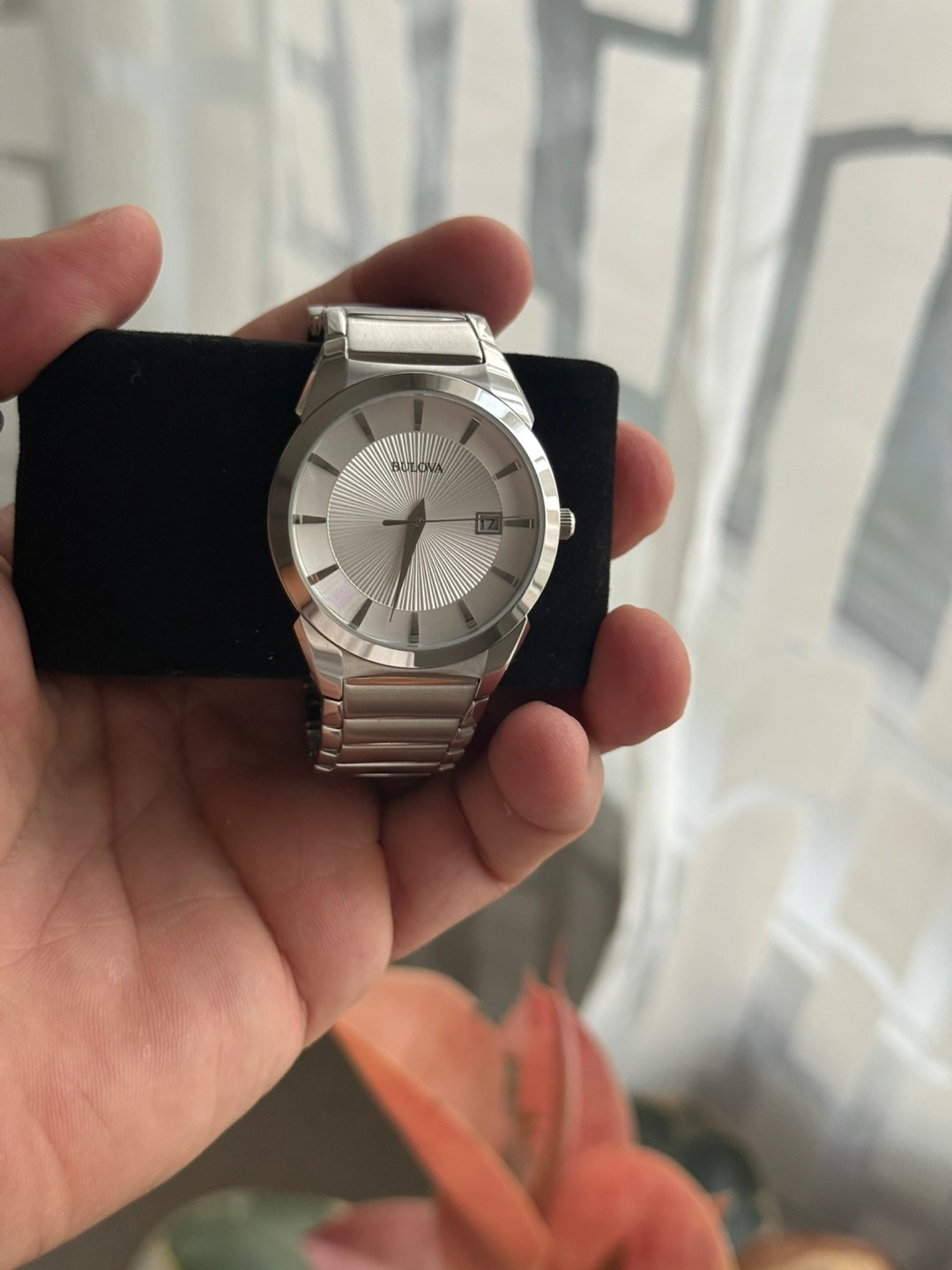 Selling a Bulova men's watch in stainless steel. It's in great condition and ready for a new home! The watch features a sleek design with a date display.