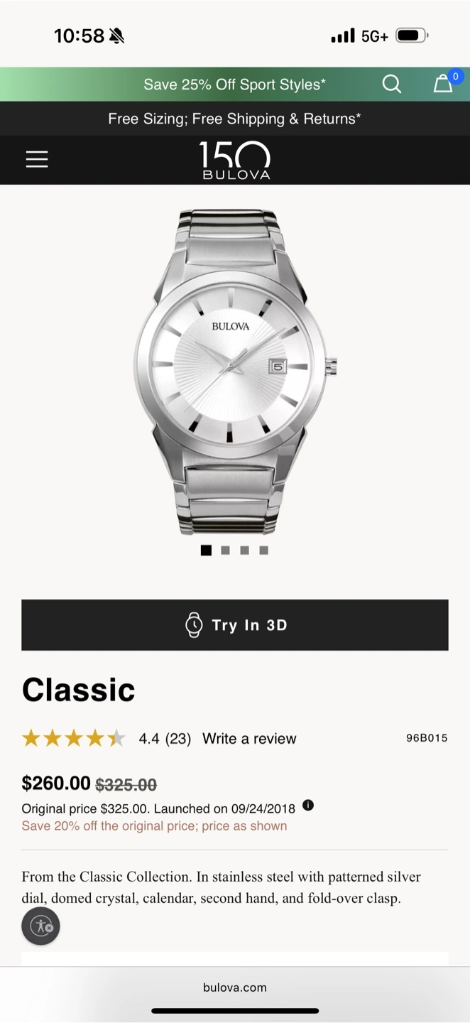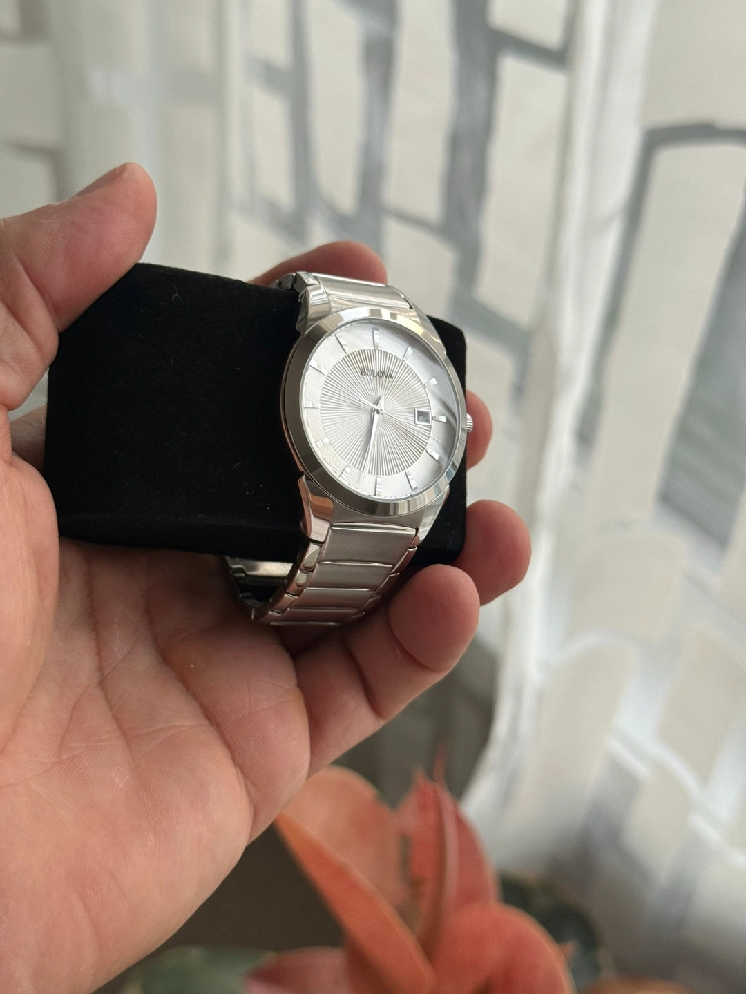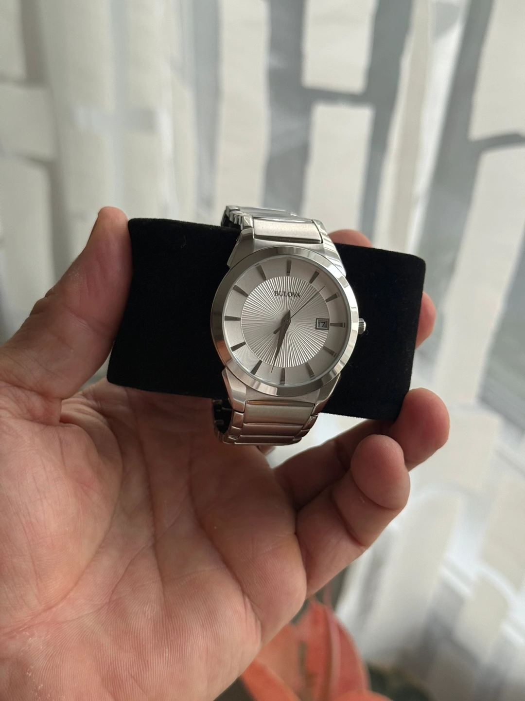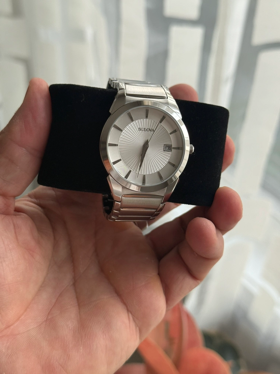 Selling a Bulova men's watch in stainless steel. It's in great condition and ready for a new home! The watch features a sleek design with a date display.