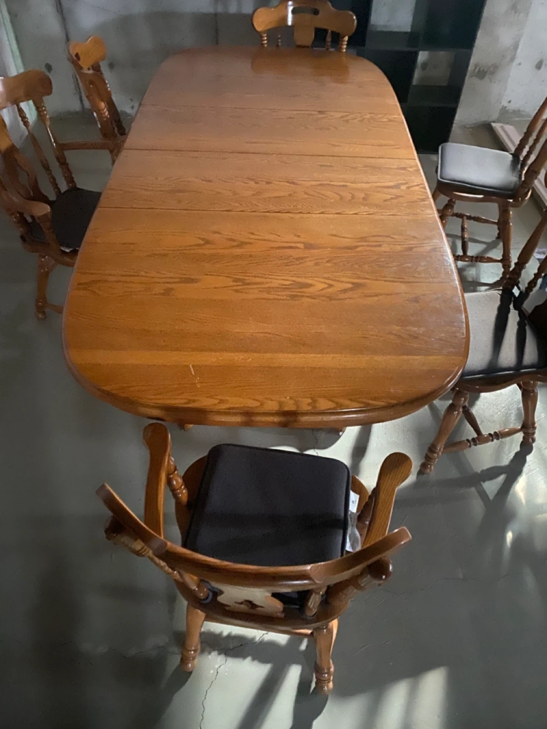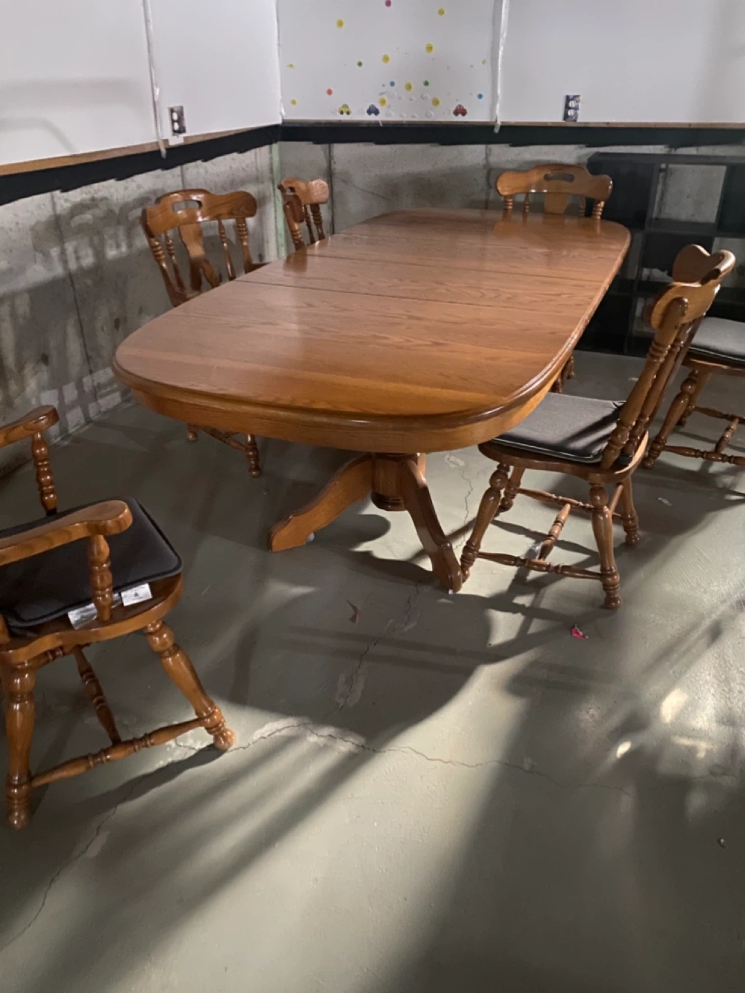 This is a solid oak dining table and six chairs. The chairs have cushioned seats. The table extends for more space. It's a classic set for family dinners!