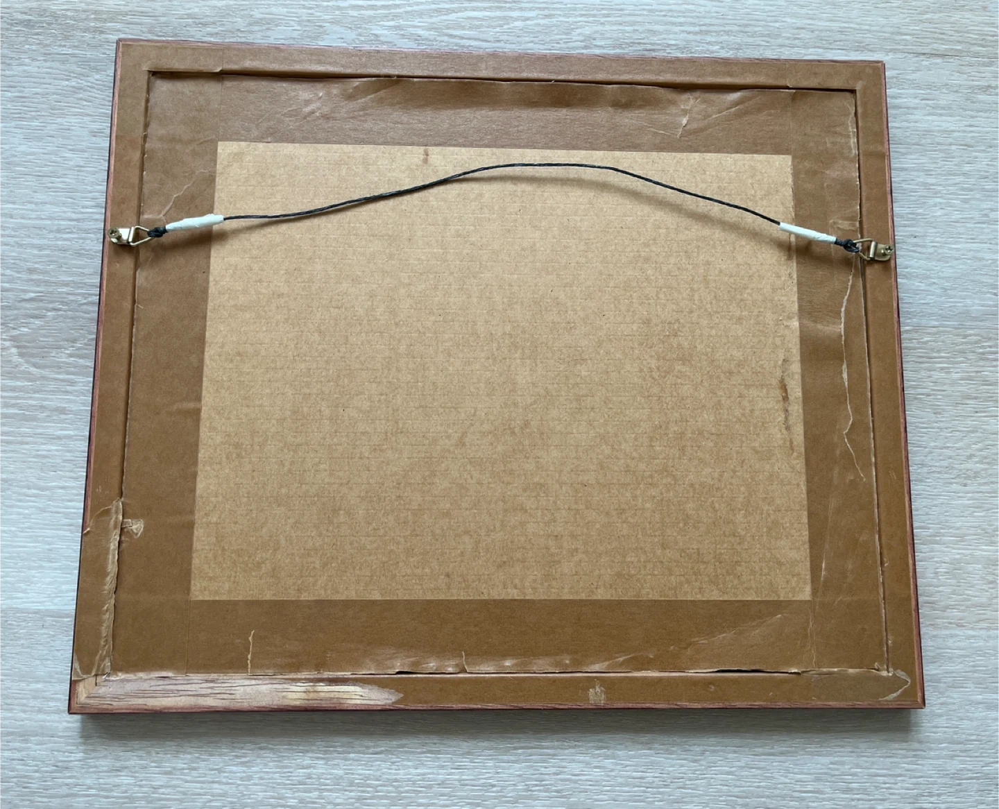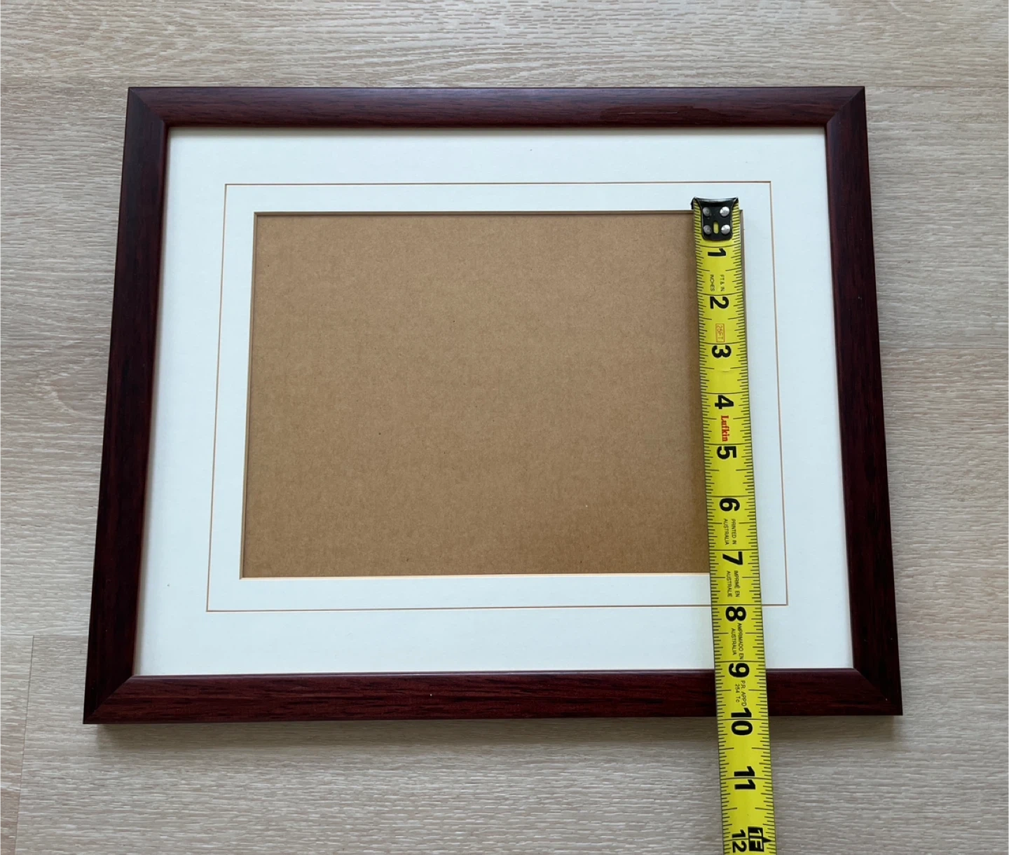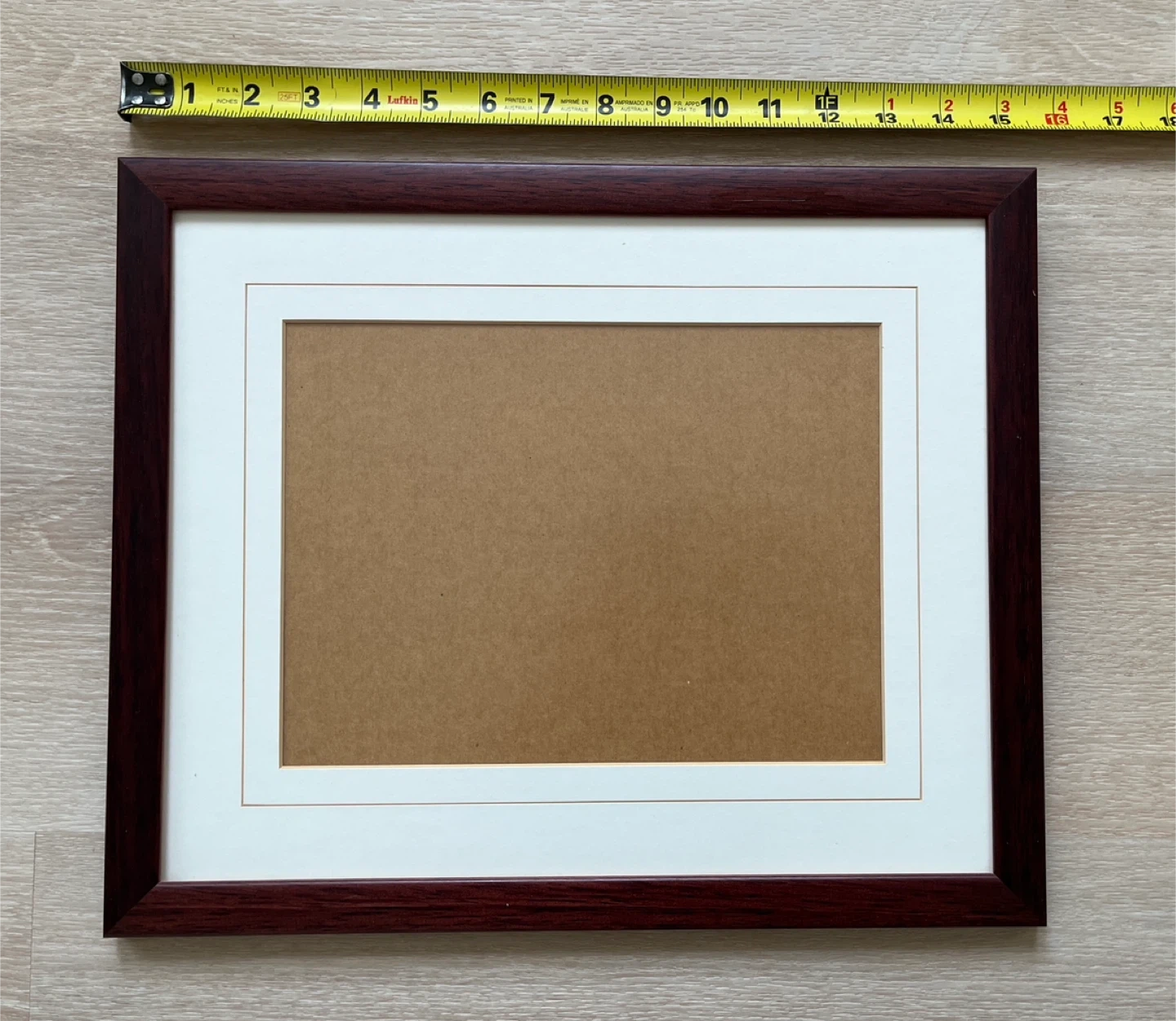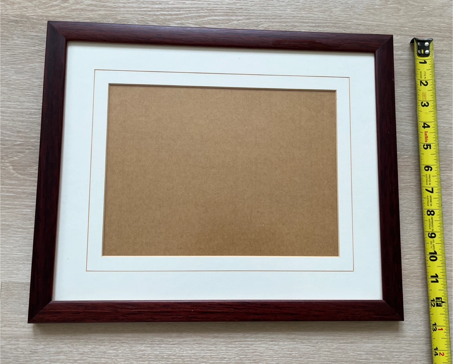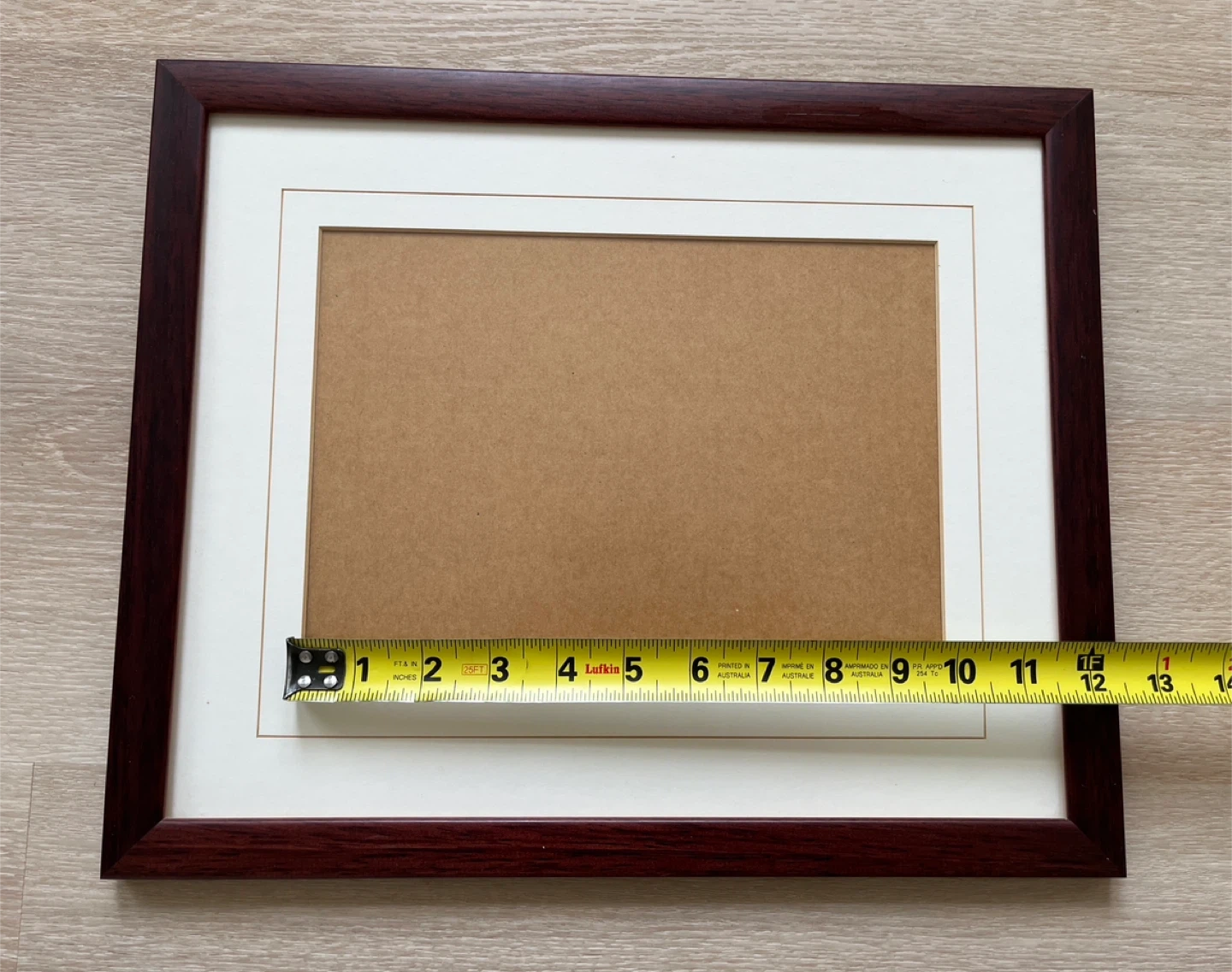 A dark wood photo frame with a white mat. The frame measures 12 inches in width and 9 inches in height. It's ready to display your favourite memories!