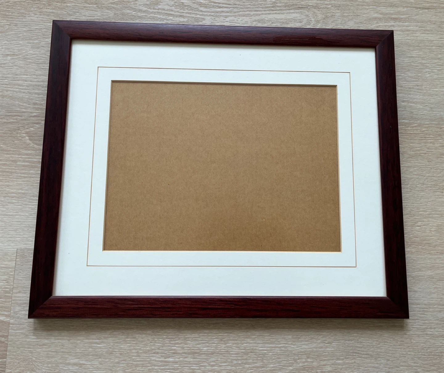 A dark wood photo frame with a white mat. The frame measures 12 inches in width and 9 inches in height. It's ready to display your favourite memories!