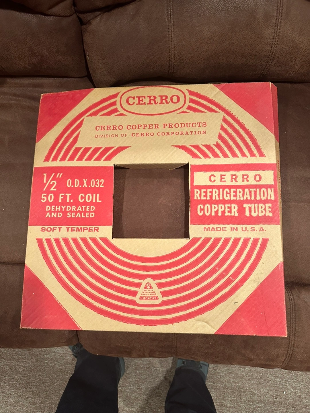 Vintage Cerro Copper Products refrigeration copper tube. 1/2 inch OD x .032 wall. 50 foot coil. Made in the USA.