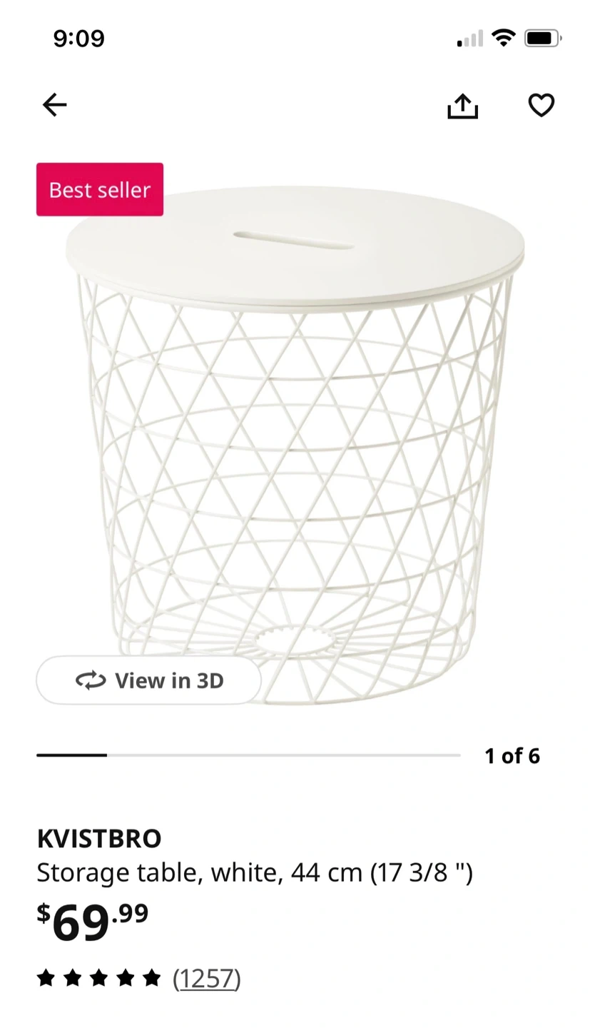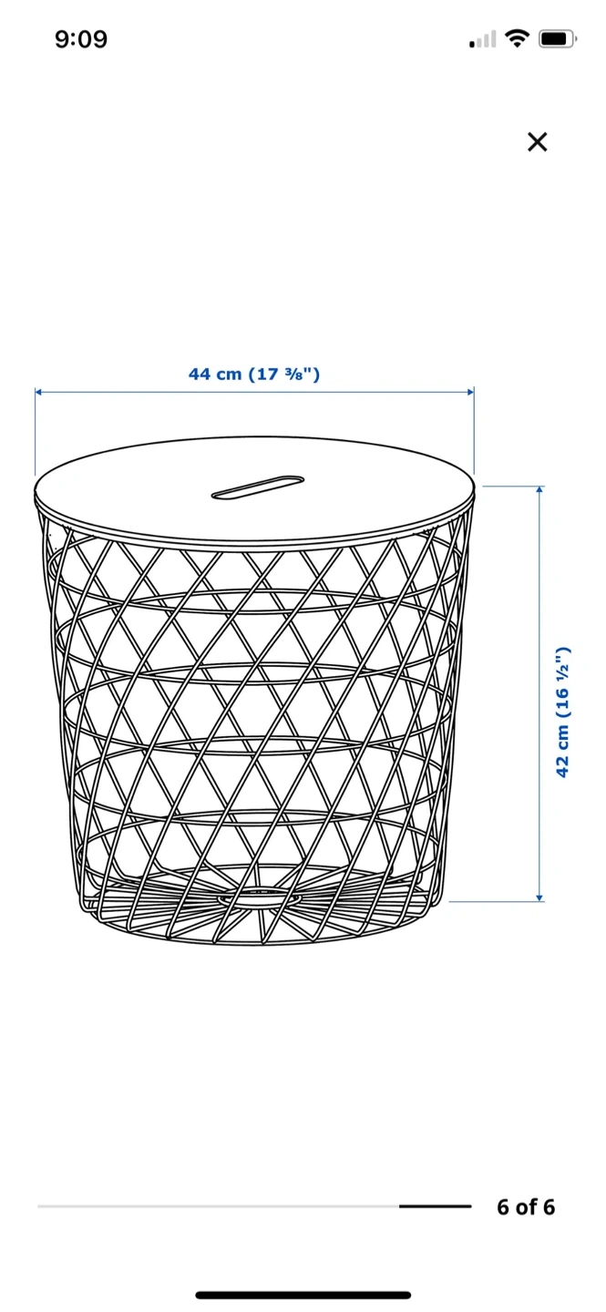 This IKEA KVISTBRO storage table is white. It measures 44 cm (17 3/8 ") in diameter and 42 cm (16 1/2 ") in height. It's a handy place to stash blankets or magazines.