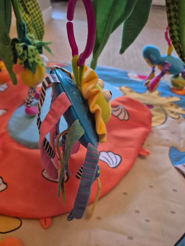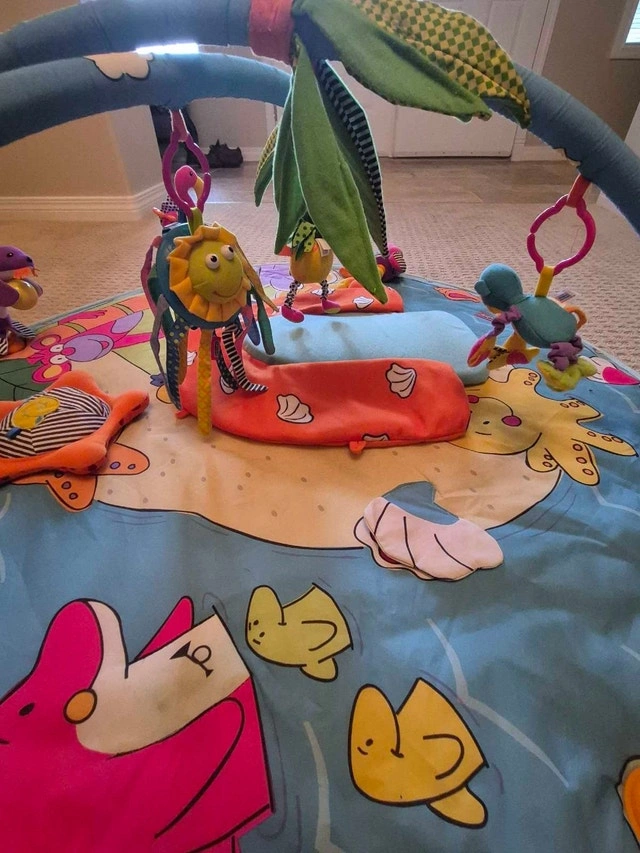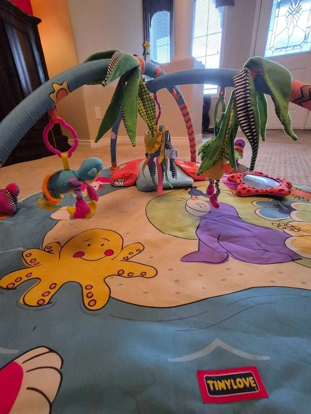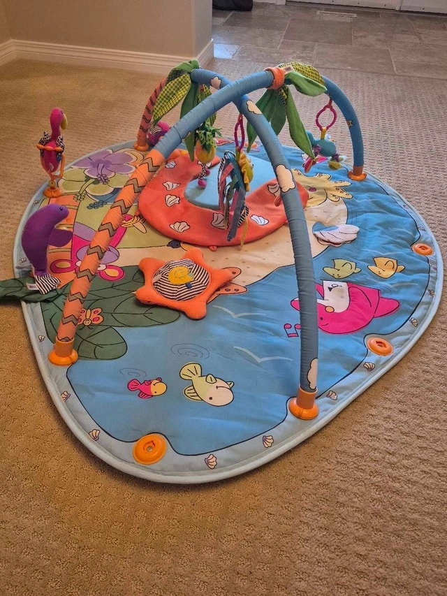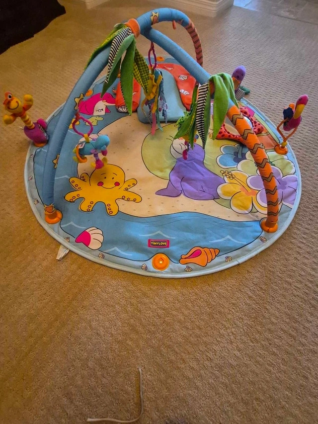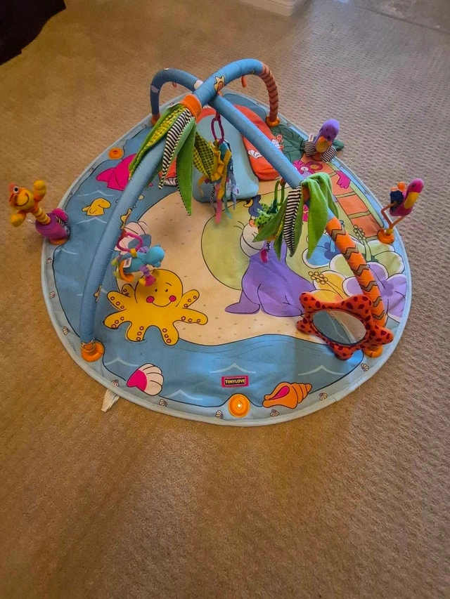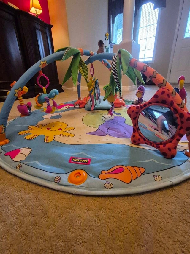 This Tiny Love infant activity gym has bright colours and several activities. It was purchased new and used for 1 child.