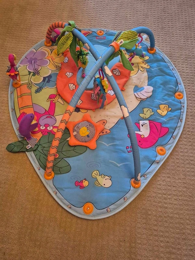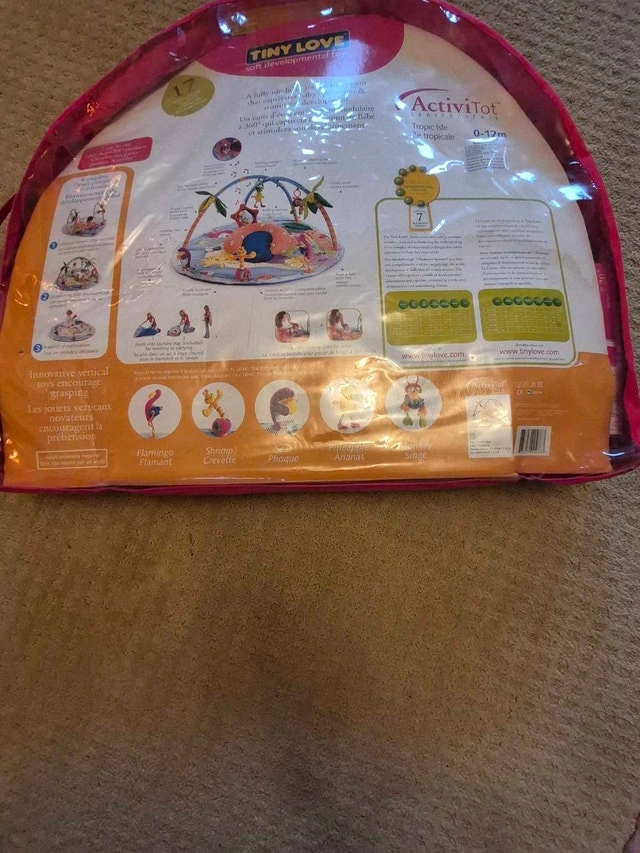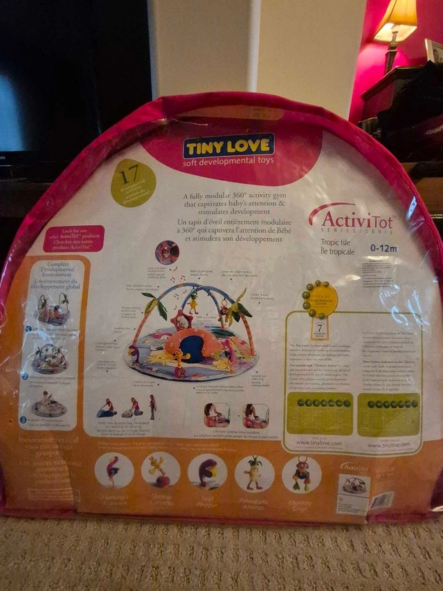 This Tiny Love infant activity gym has bright colours and several activities. It was purchased new and used for 1 child.