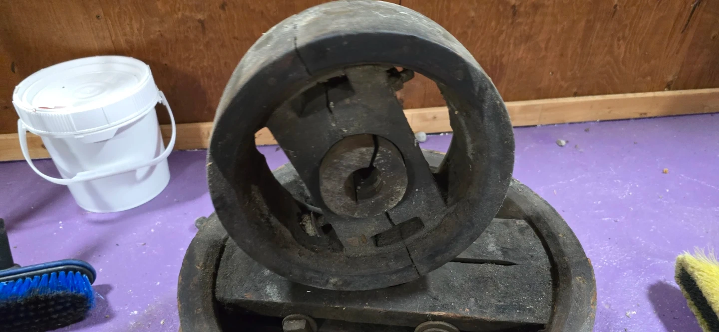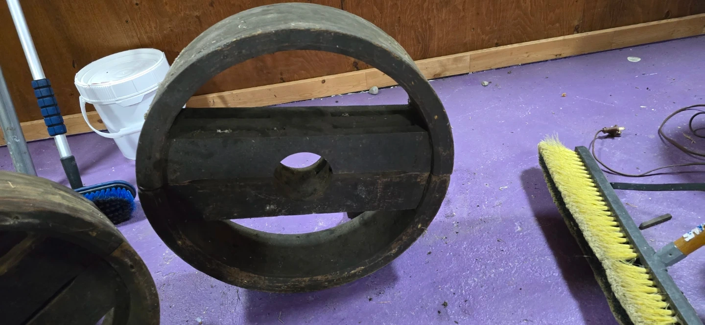 This is a vintage wooden pulley wheel system. It's made of sturdy wood and appears to be a functional mechanical component. Great for rustic decor or as a unique piece for a workshop! These were in a factory in Hamilton Ontario. 4 wooden pulleys taken out of service from an old freight elevator by myself. Make a reasonable offer. I HAVE FOUND 3 MORE OF THE SMALLER SIZE. SAME PRICE. $100 for all.