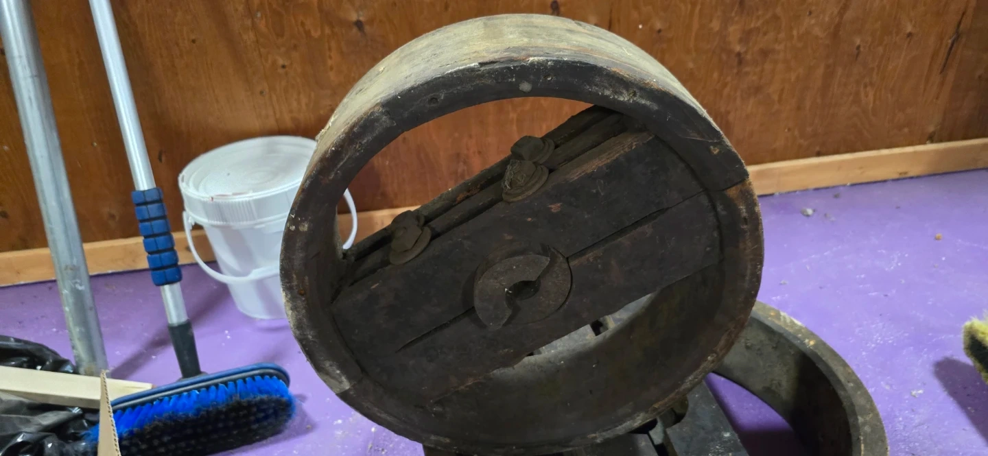 This is a vintage wooden pulley wheel system. It's made of sturdy wood and appears to be a functional mechanical component. Great for rustic decor or as a unique piece for a workshop! These were in a factory in Hamilton Ontario. 4 wooden pulleys taken out of service from an old freight elevator by myself. Make a reasonable offer. I HAVE FOUND 3 MORE OF THE SMALLER SIZE. SAME PRICE. $100 for all.