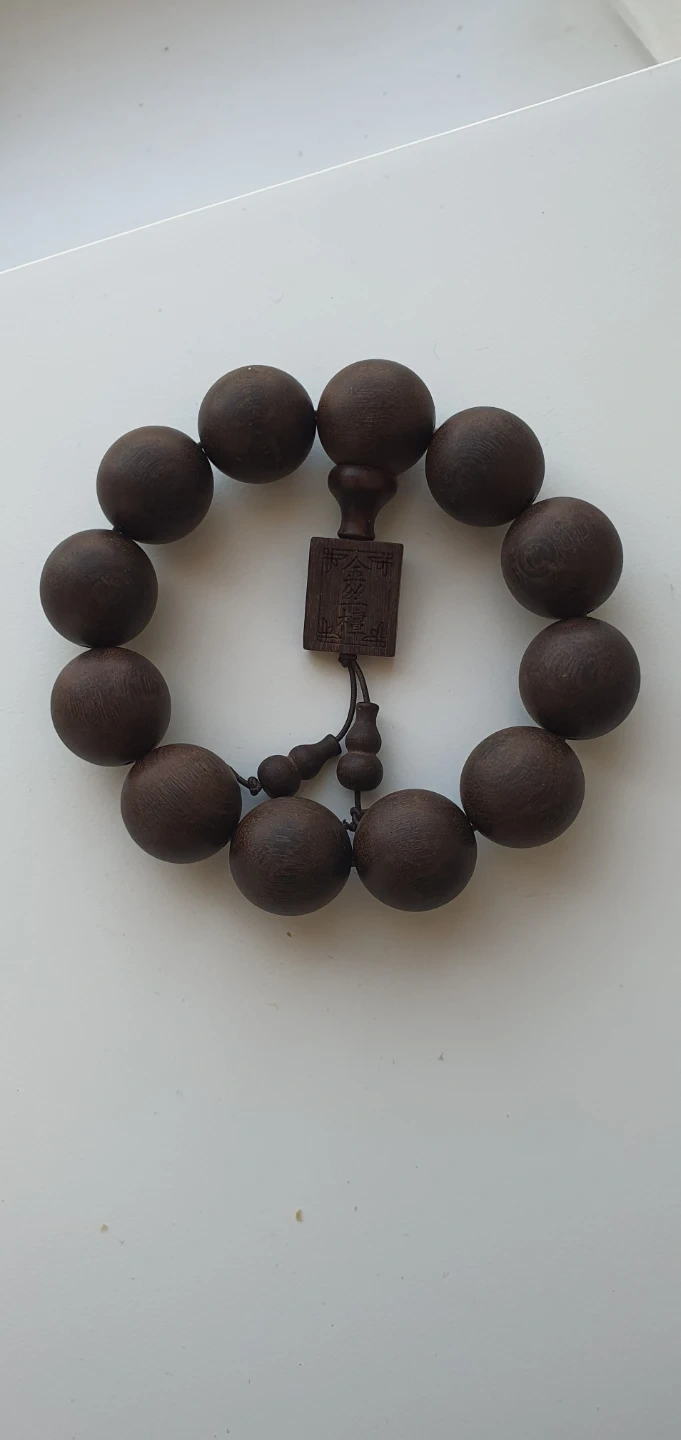 A dark wood beaded bracelet with a carved charm. It has a classic look and feel. This bracelet is suitable for everyday wear.