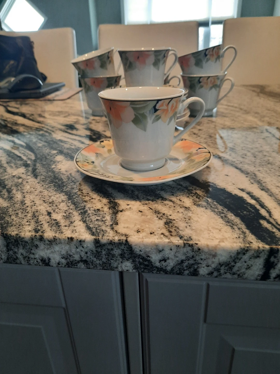 Hello to my thrifty shopper! I have a set of six ceramic tea/coffee/hot chocolate China wear tea/coffee/hot chocolate cups with matching saucers, featuring a floral design. These pretty tea/coffee/hot chocolate cups are perfect for enjoying your favourite hot beverage. Dishwasher safe. YEAH!! They were used once so basically new. I am downsizing. Shame to let these go however I would love you to enjoy them. ๐