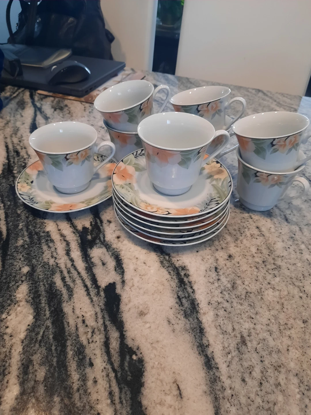 Hello to my thrifty shopper! I have a set of six ceramic tea/coffee/hot chocolate China wear tea/coffee/hot chocolate cups with matching saucers, featuring a floral design. These pretty tea/coffee/hot chocolate cups are perfect for enjoying your favourite hot beverage. Dishwasher safe. YEAH!! They were used once so basically new. I am downsizing. Shame to let these go however I would love you to enjoy them. ๐