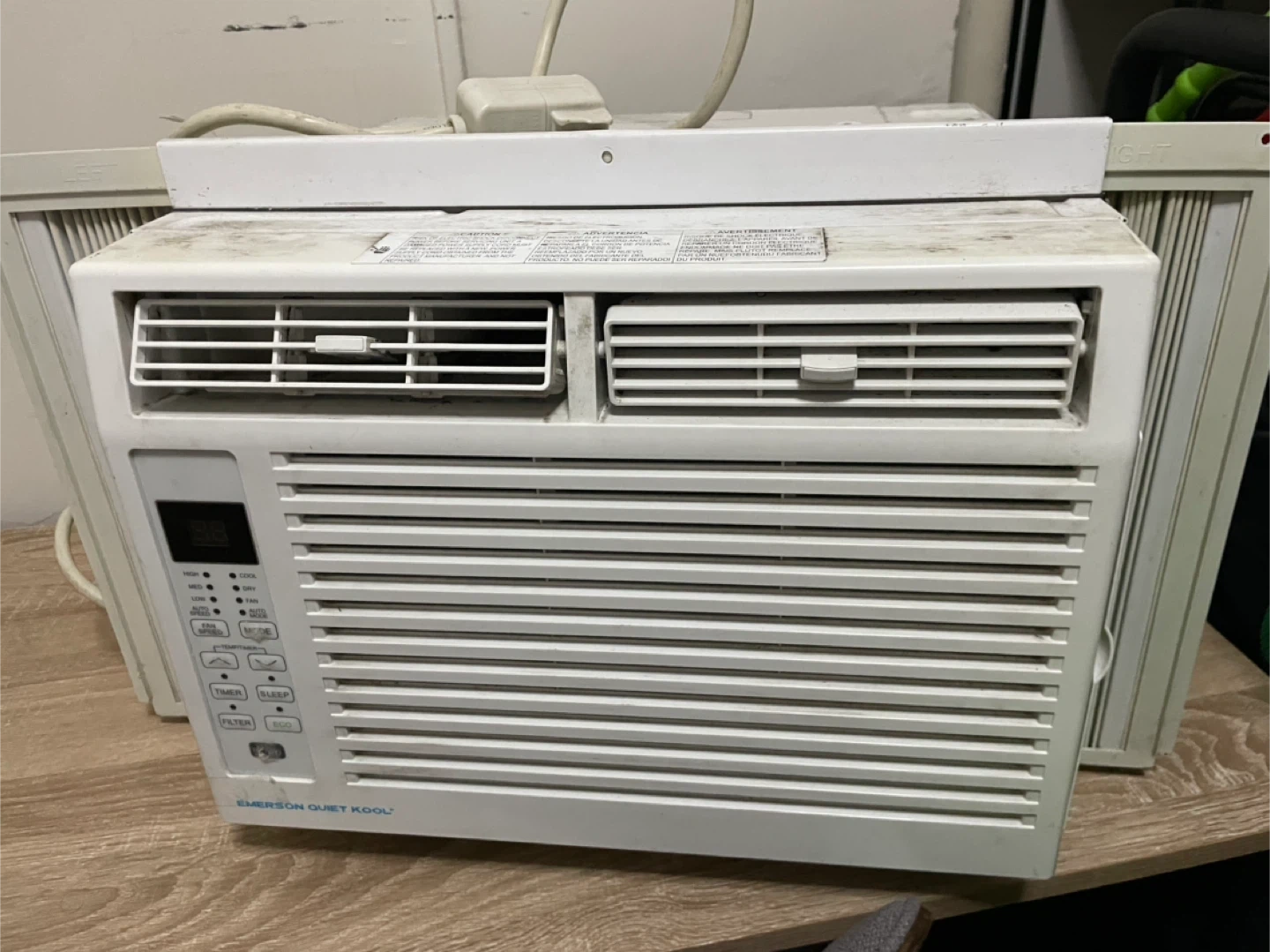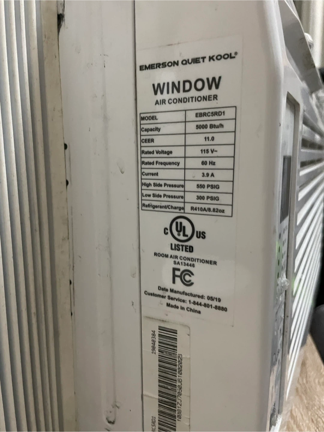 Emerson Quiet Kool window air conditioner. Model EBRC5R D1. Capacity 5000 Btu/h. Rated Voltage 115 V. Manufactured 05/19. This unit is ready to cool your room!