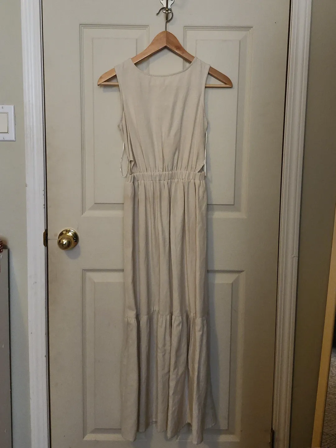This cream-coloured maxi dress is made from a linen blend fabric. It features a sleeveless design with a smocked back panel and a tie closure at the back. The tiered skirt adds a lovely flow.