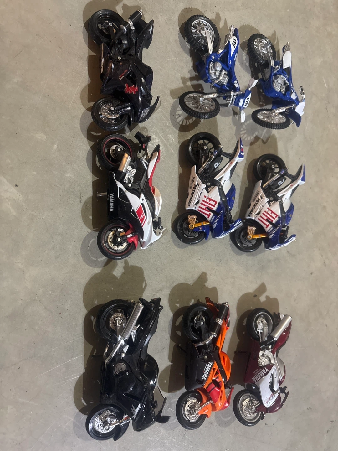 A collection of 8 Yamaha diecast model motorcycles +1 Honda. Features various sportbike and dirt bike designs with working suspension . These models are great for display or for collectors. $12 each or $100 for all