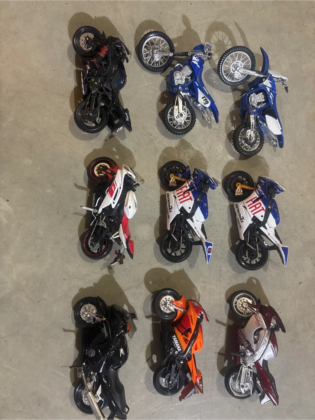 A collection of 8 Yamaha diecast model motorcycles +1 Honda. Features various sportbike and dirt bike designs with working suspension . These models are great for display or for collectors. $12 each or $100 for all