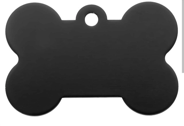 This sleek, black, bone-shaped pet tag is perfect for your furry friend's collar, adding a touch of reassurance for their safety. Crafted from durable material, it's ready to be personalized with your pet's name and your contact information. It is new and has never been used. Having a personalized pet tag is like giving your pet a VIP pass to 'Returned Home' avenue! If the squirrels ever lead them astray, this tag will be their ticket back. Cash accepted.