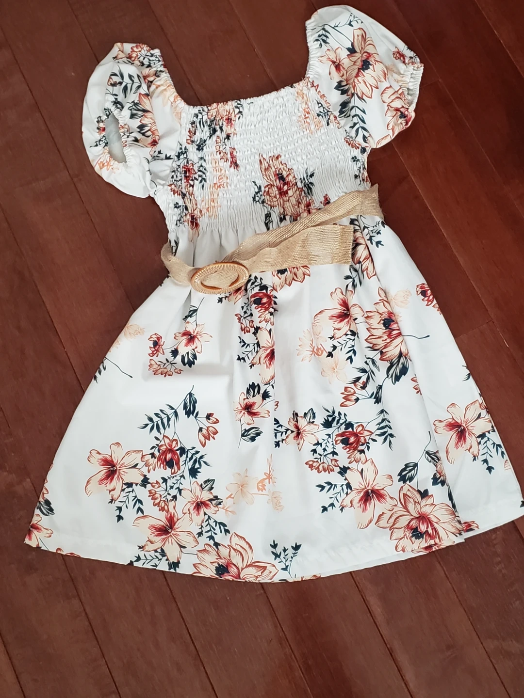 White dress with a colourful floral print and short puff sleeves. It features a smocked bodice and comes with a braided belt with a circular buckle. Perfect for warm weather occasions!