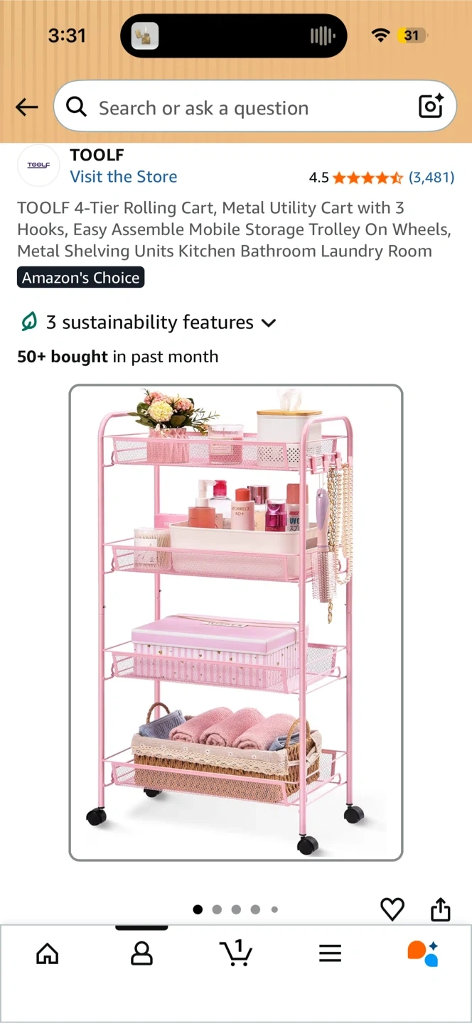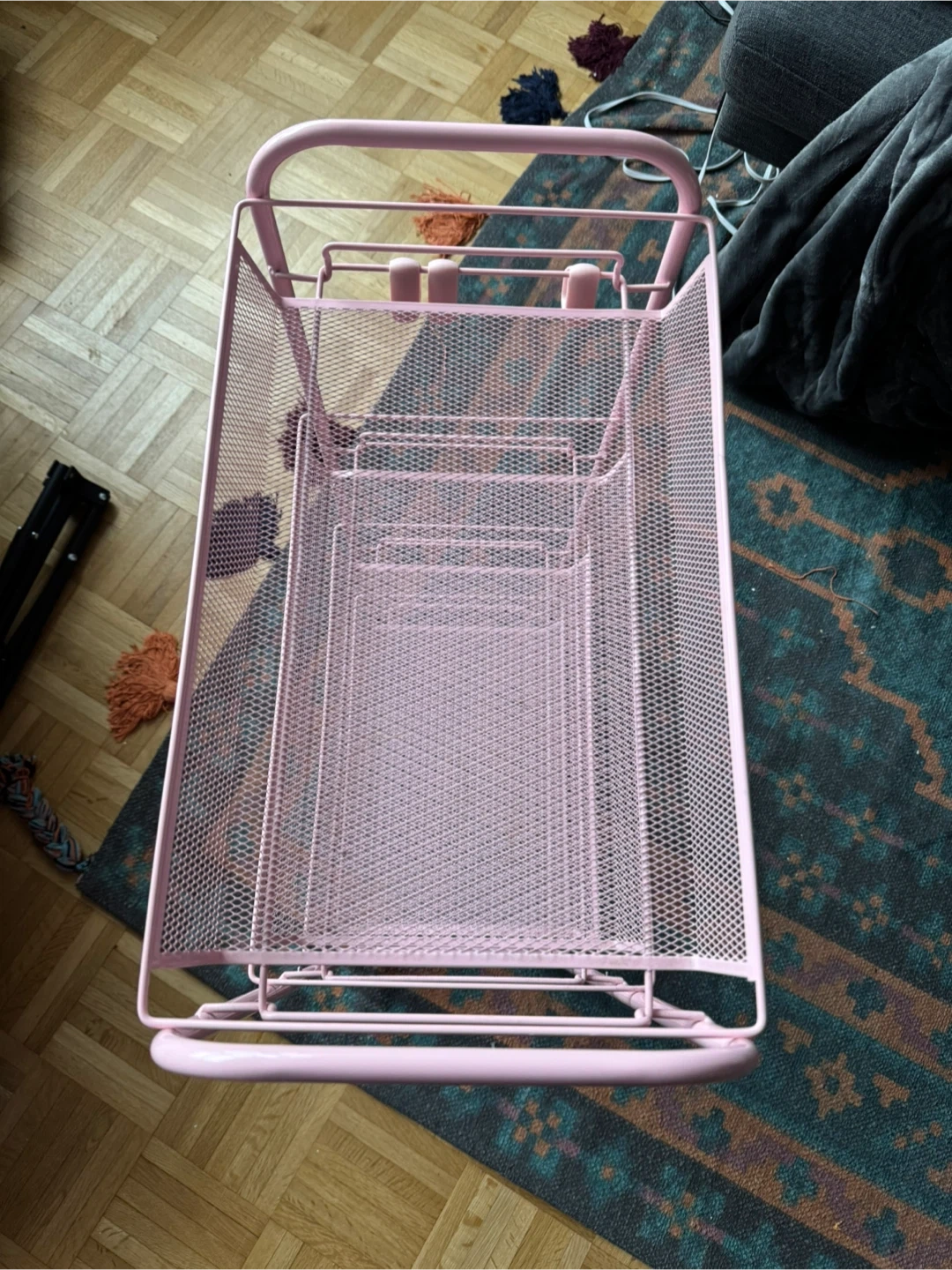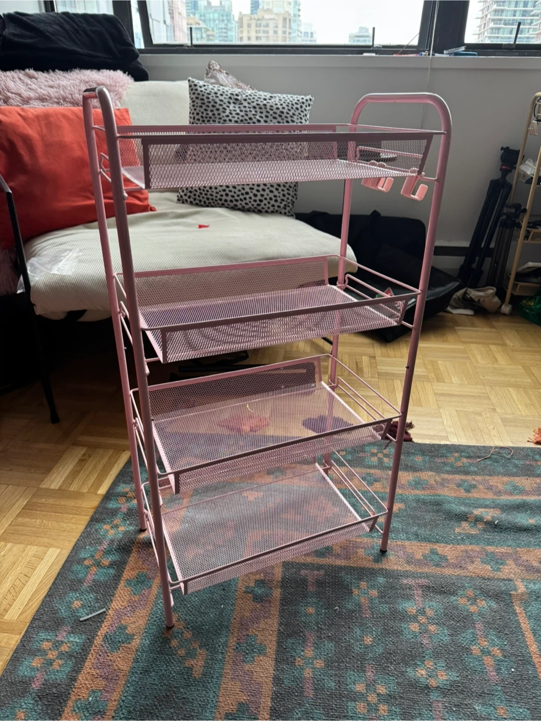 This pink metal rolling cart has four mesh tiers and three hooks. Its dimensions are 32.6" high, 17.2" wide, and 10.2" deep. The baskets are 8.4" deep.