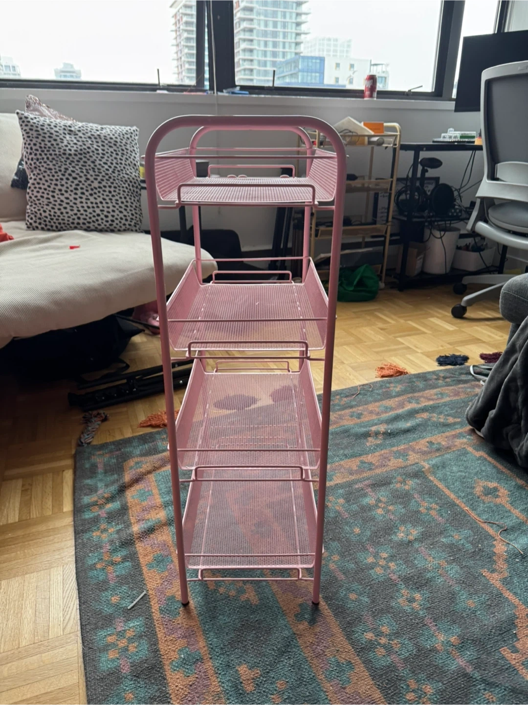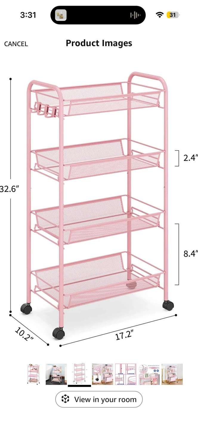 This pink metal rolling cart has four mesh tiers and three hooks. Its dimensions are 32.6" high, 17.2" wide, and 10.2" deep. The baskets are 8.4" deep.