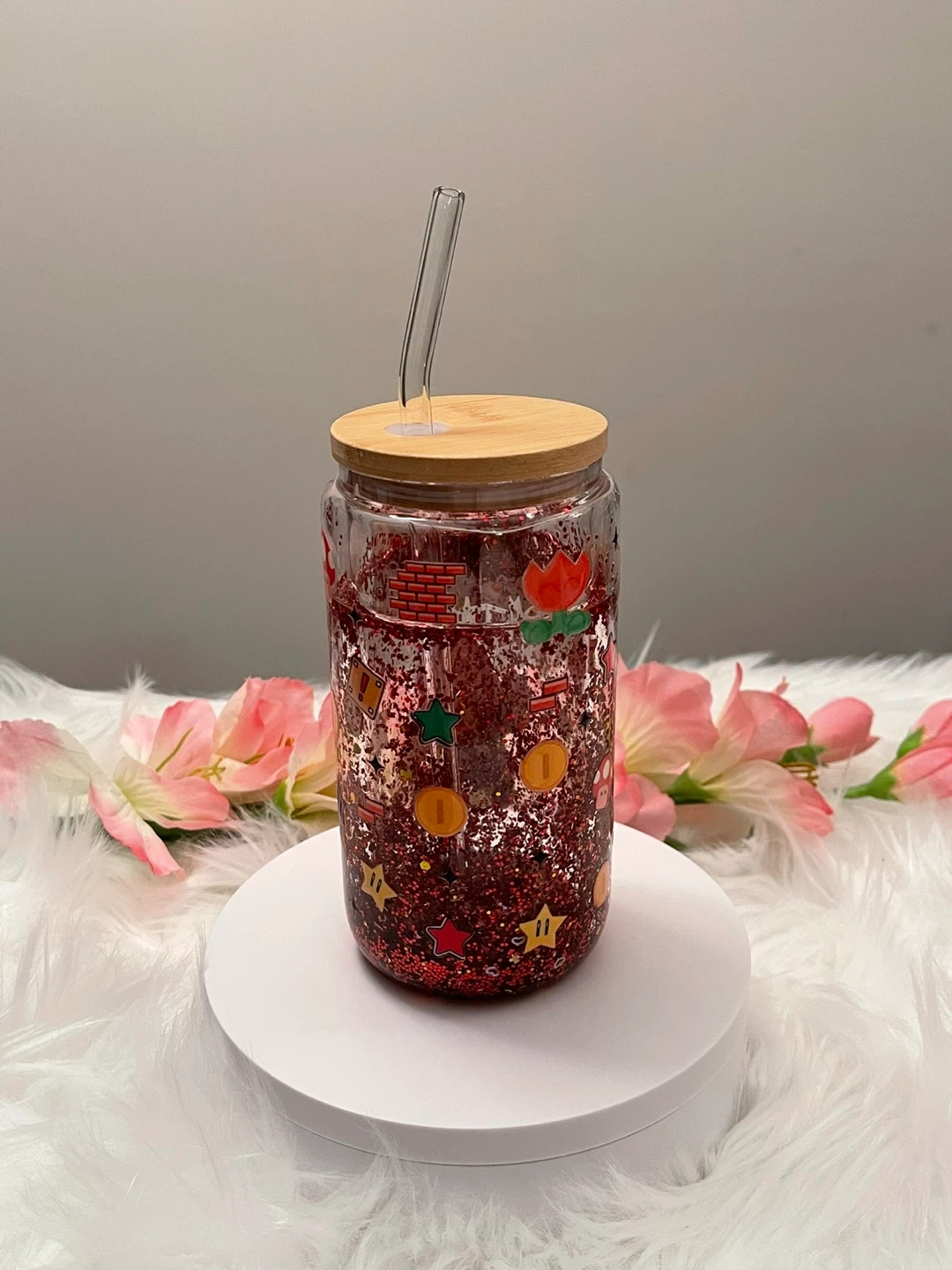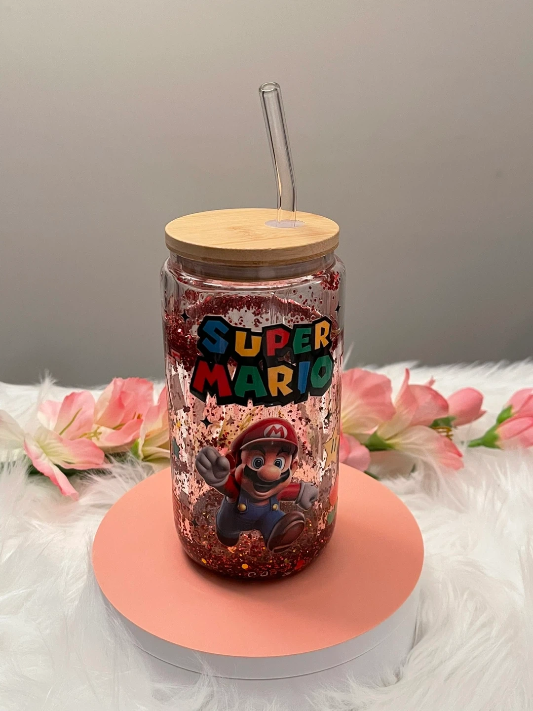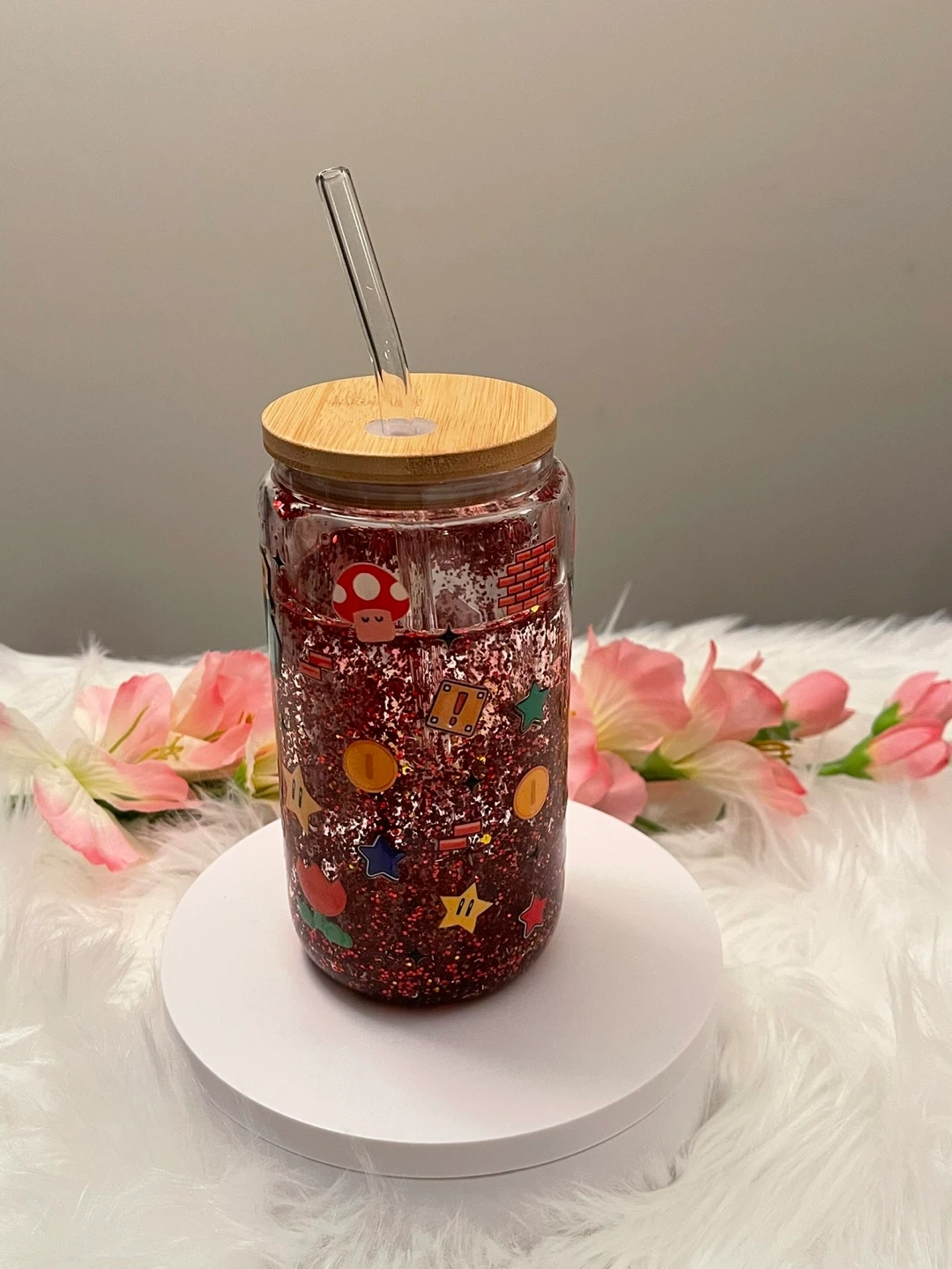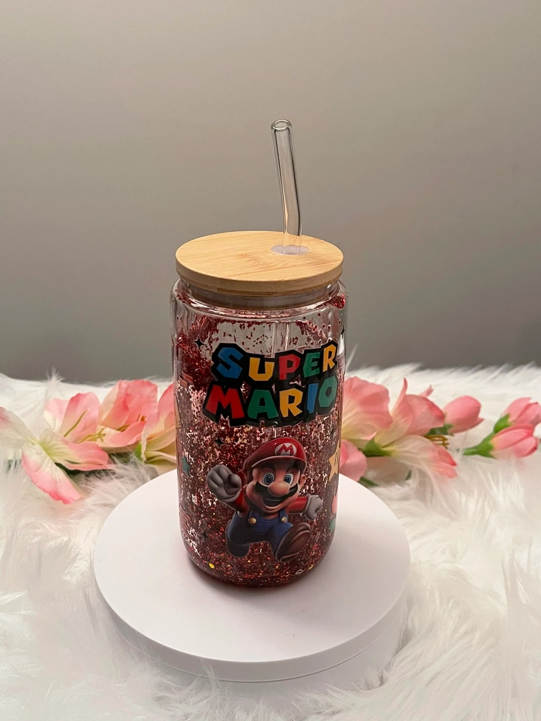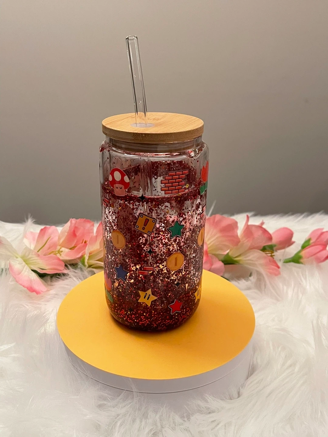 This is a Super Mario themed tumbler, perfect for any fan! It features a fun glitter design with iconic Super Mario elements. Comes with a straw and a bamboo lid.