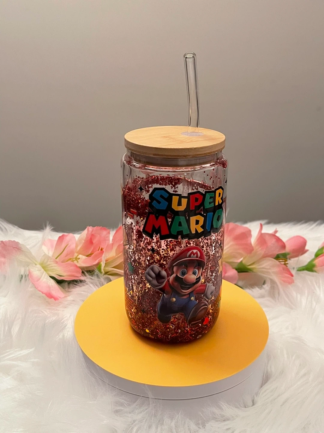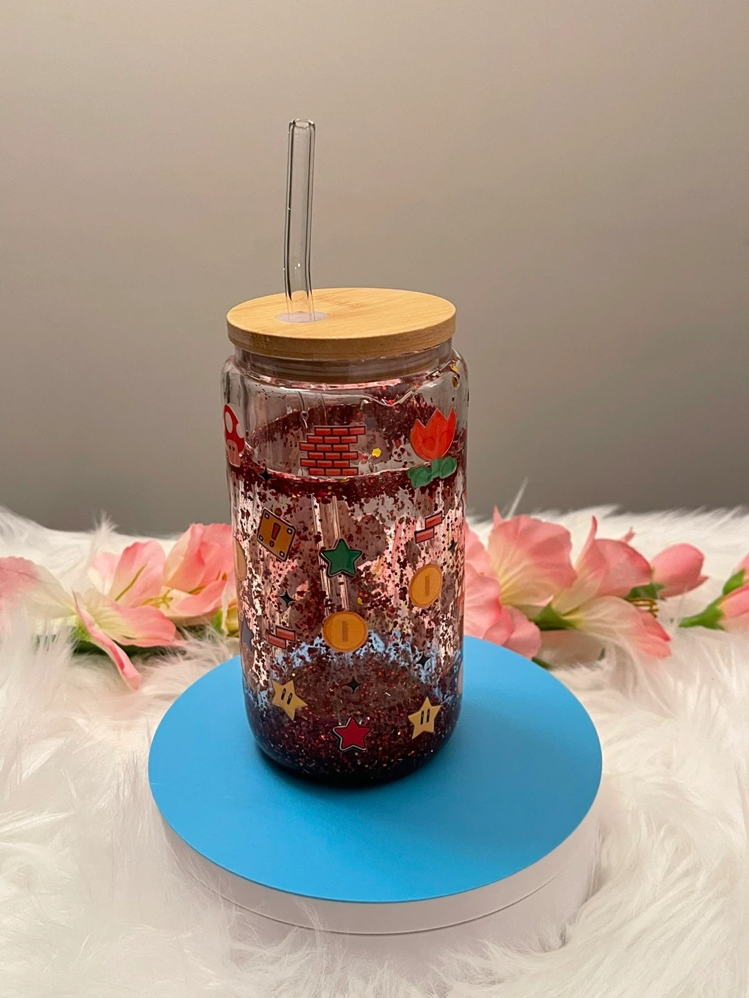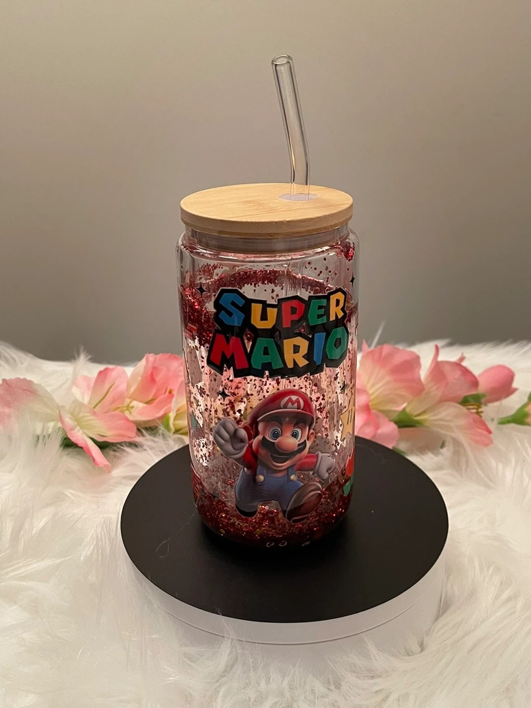 This is a Super Mario themed tumbler, perfect for any fan! It features a fun glitter design with iconic Super Mario elements. Comes with a straw and a bamboo lid.