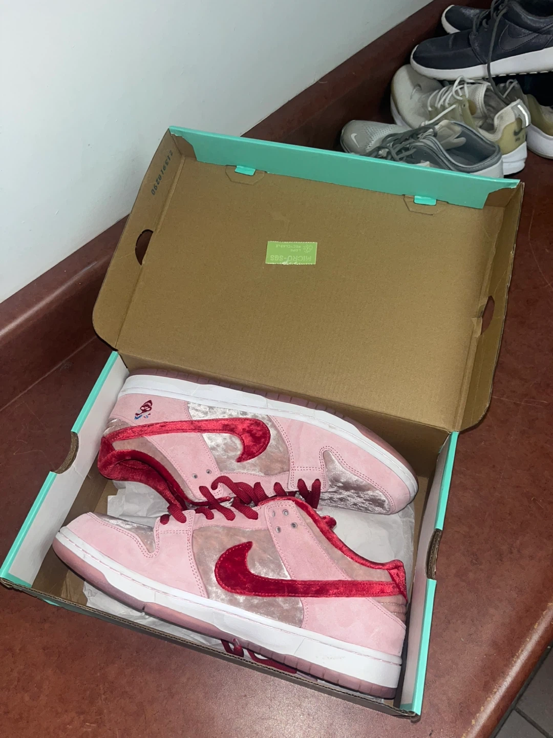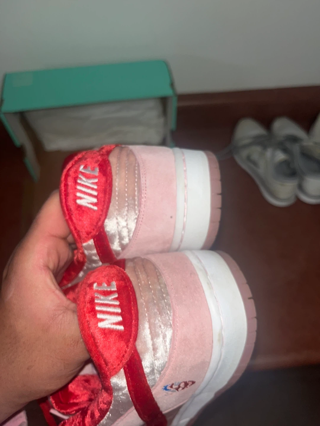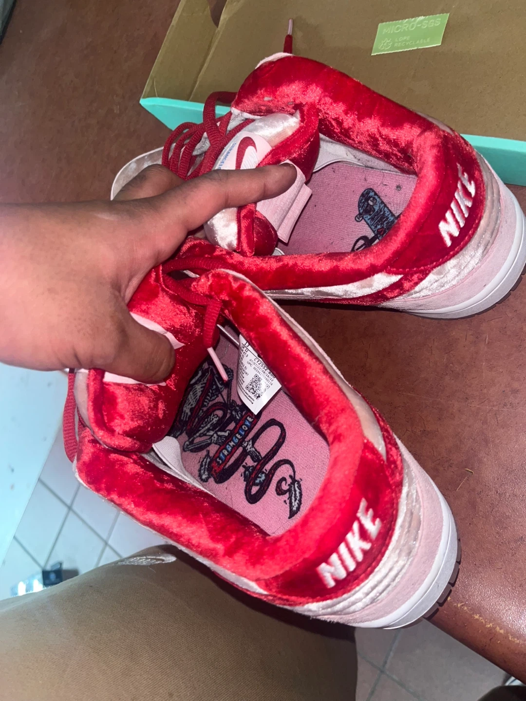 These Nike SB Dunk Lows feature a pink velvet and suede upper with red accents. Includes original box. These sneakers are a statement piece for any collection!