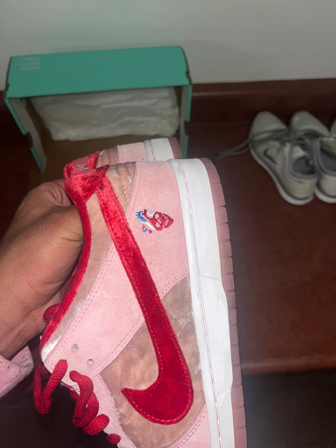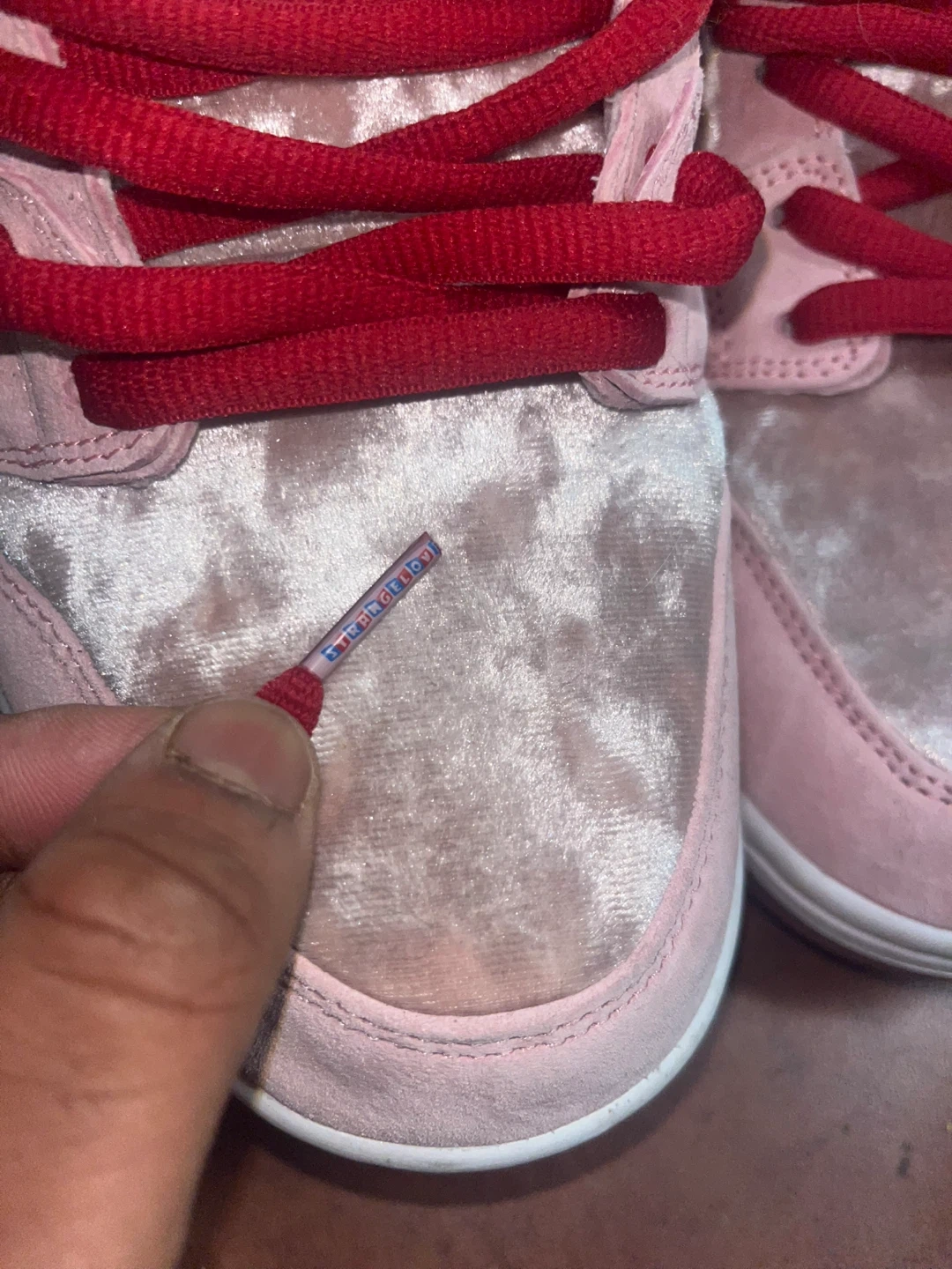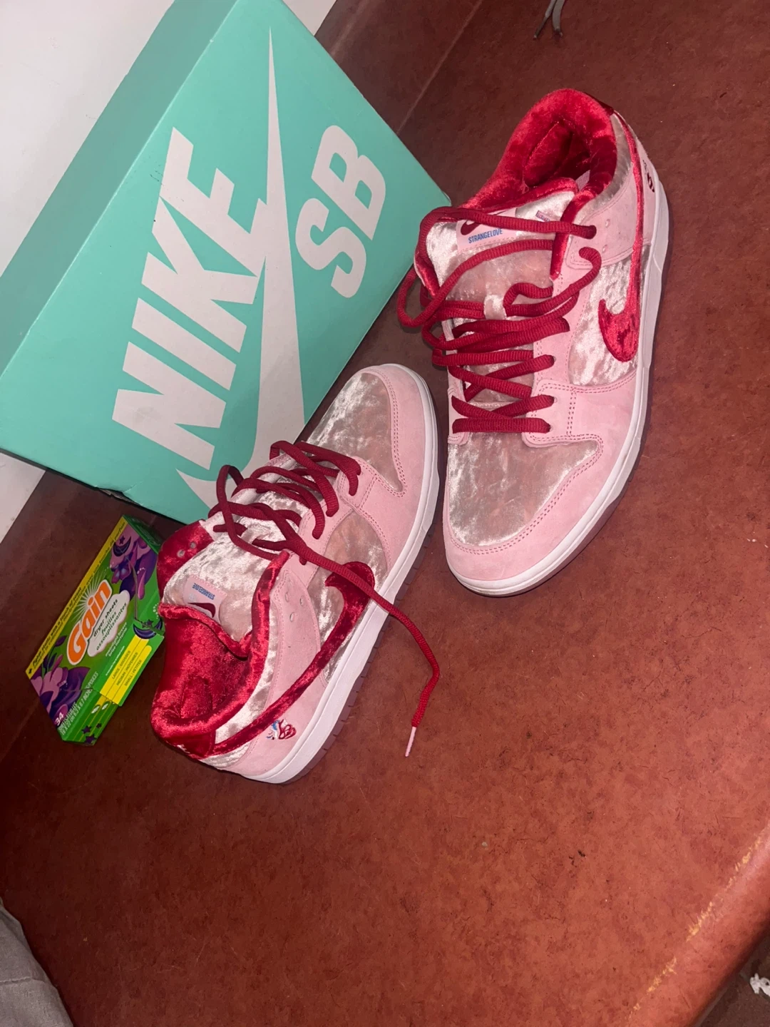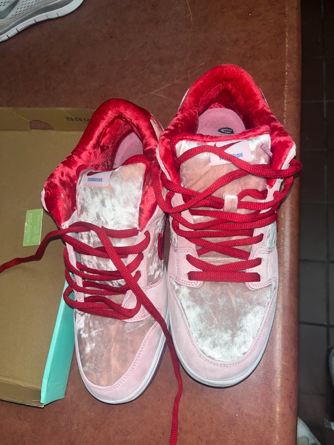 These Nike SB Dunk Lows feature a pink velvet and suede upper with red accents. Includes original box. These sneakers are a statement piece for any collection!