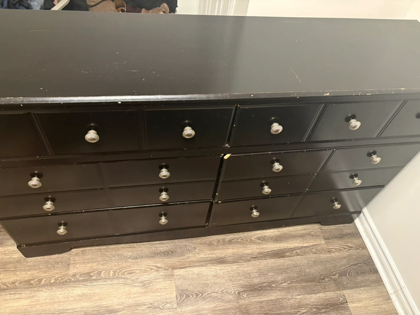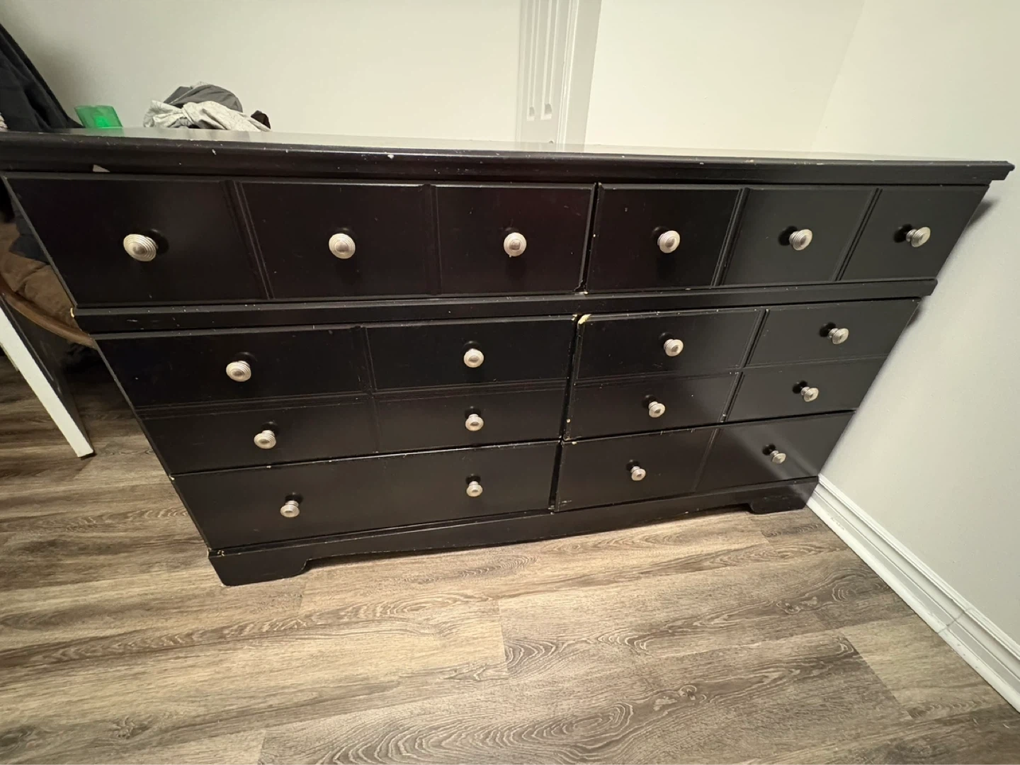 This is a black dresser with 6 drawers. Very deep drawers , all of dresser Is made of wood. In good condition, drawers all work smoothly, have no space for it anymore