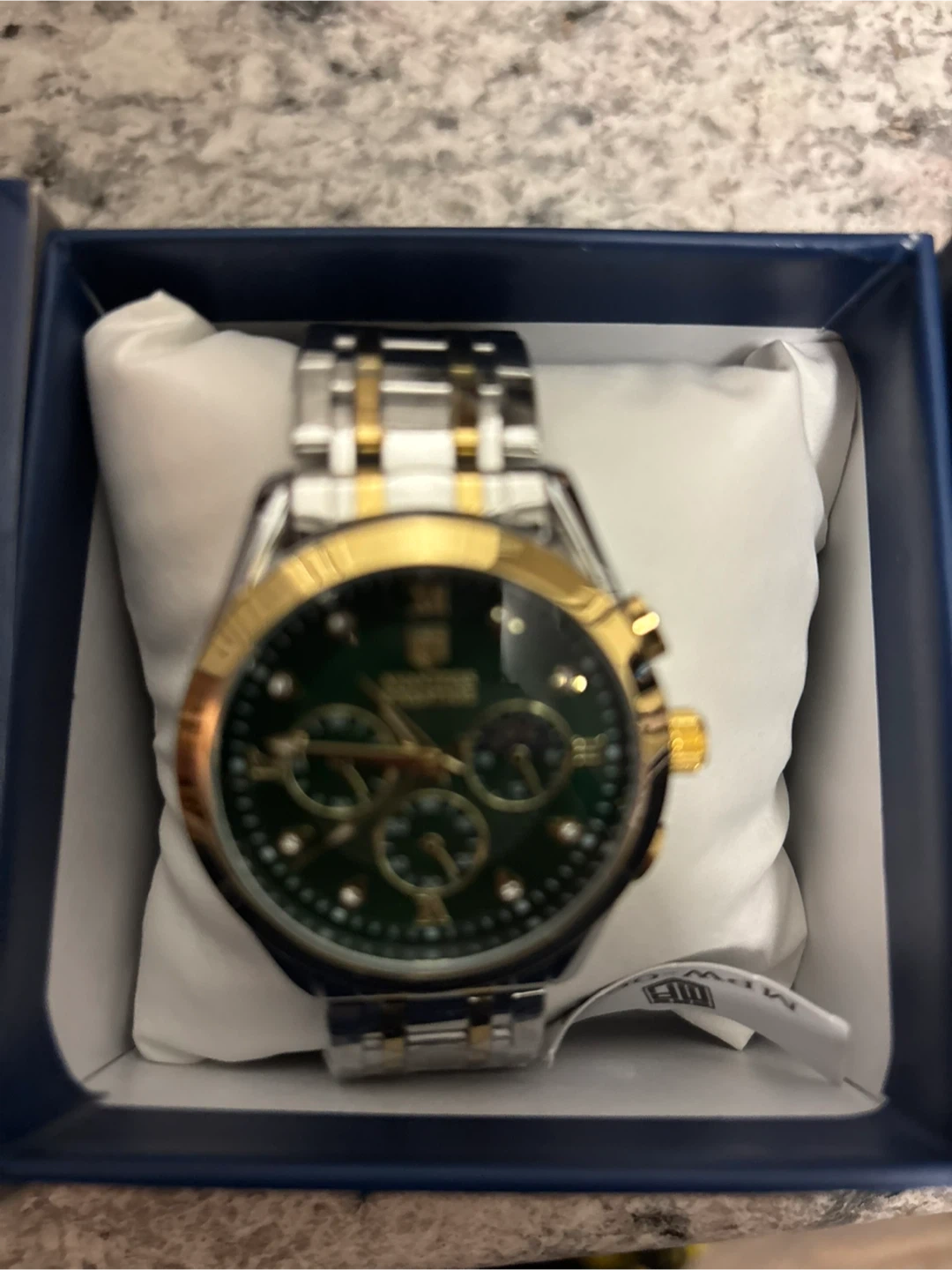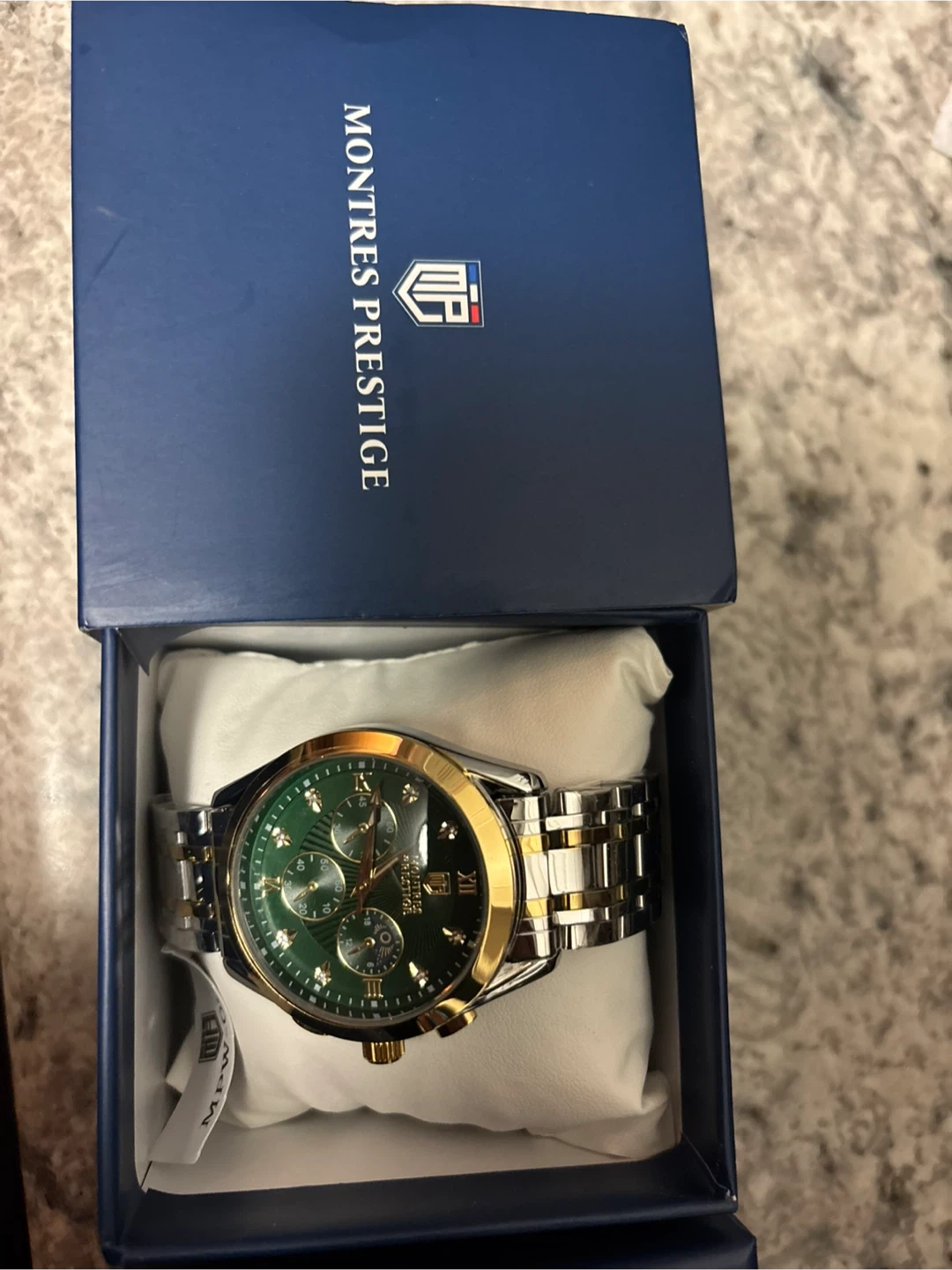 This Montres Prestige watch features a two-tone stainless steel band in gold and silver. It has a green dial with Roman numeral hour markers and sub-dials. Includes original box. It's a stylish accessory for any occasion!