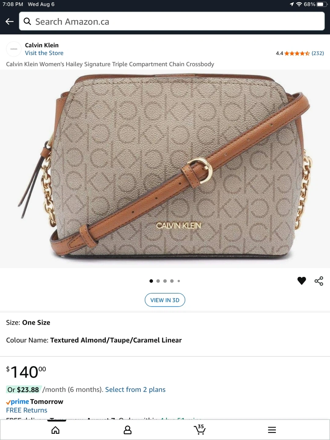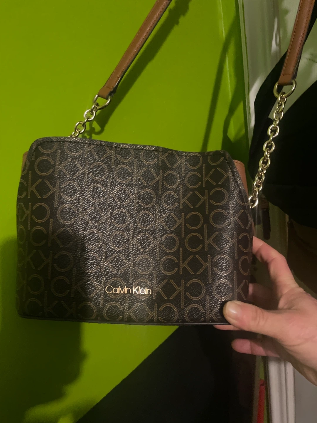 Calvin Klein women's crossbody bag with signature print. Features a chain and leather strap. One size fits all.