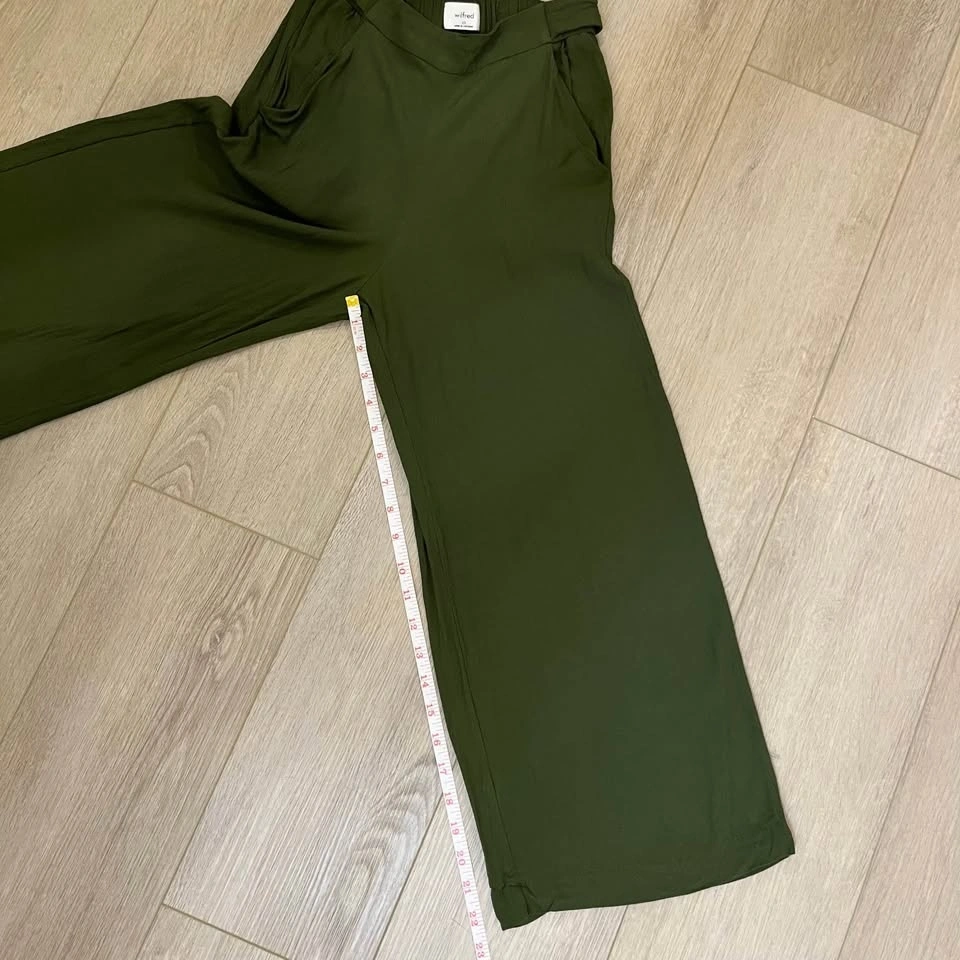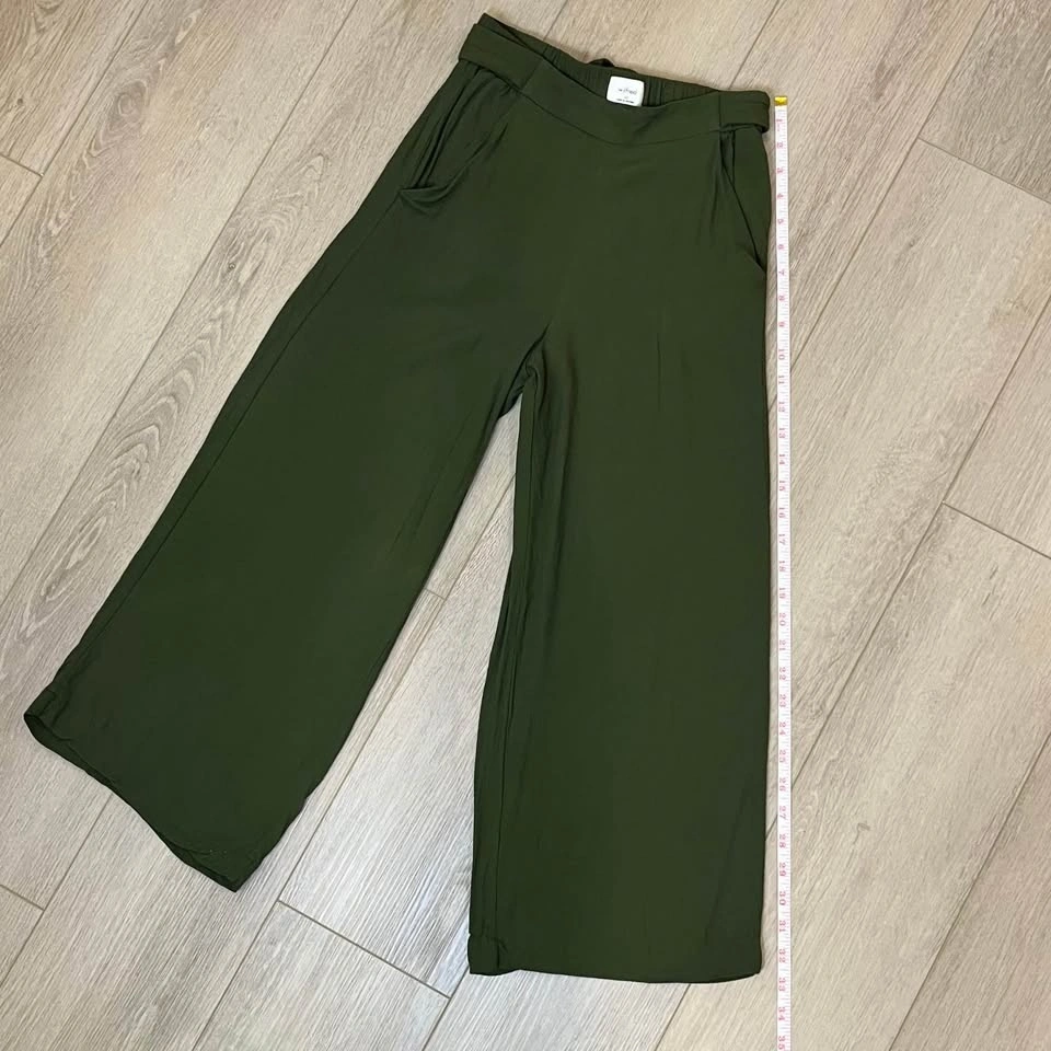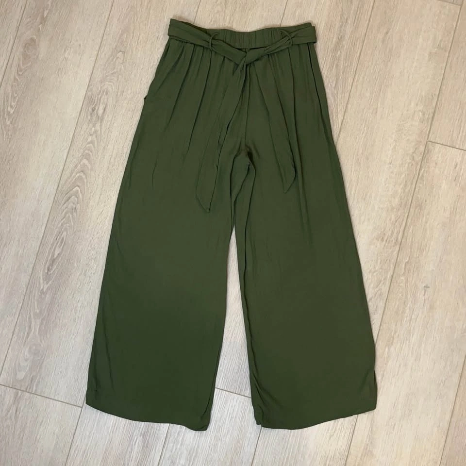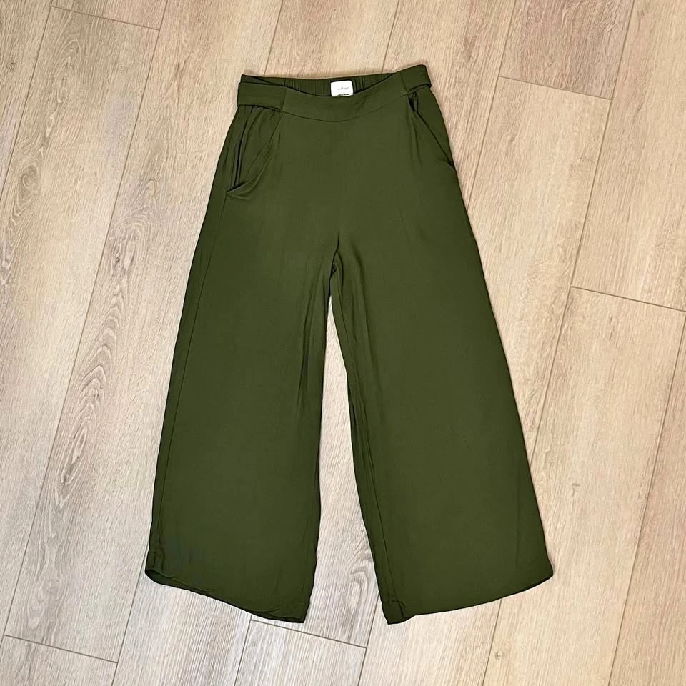 Forest/olive green trousers by Wilfred from Aritzia. Elastic waist. Wide leg. 3/4 length (measurements below). Half sash that wraps around sides and ties in back (details shown in pictures).