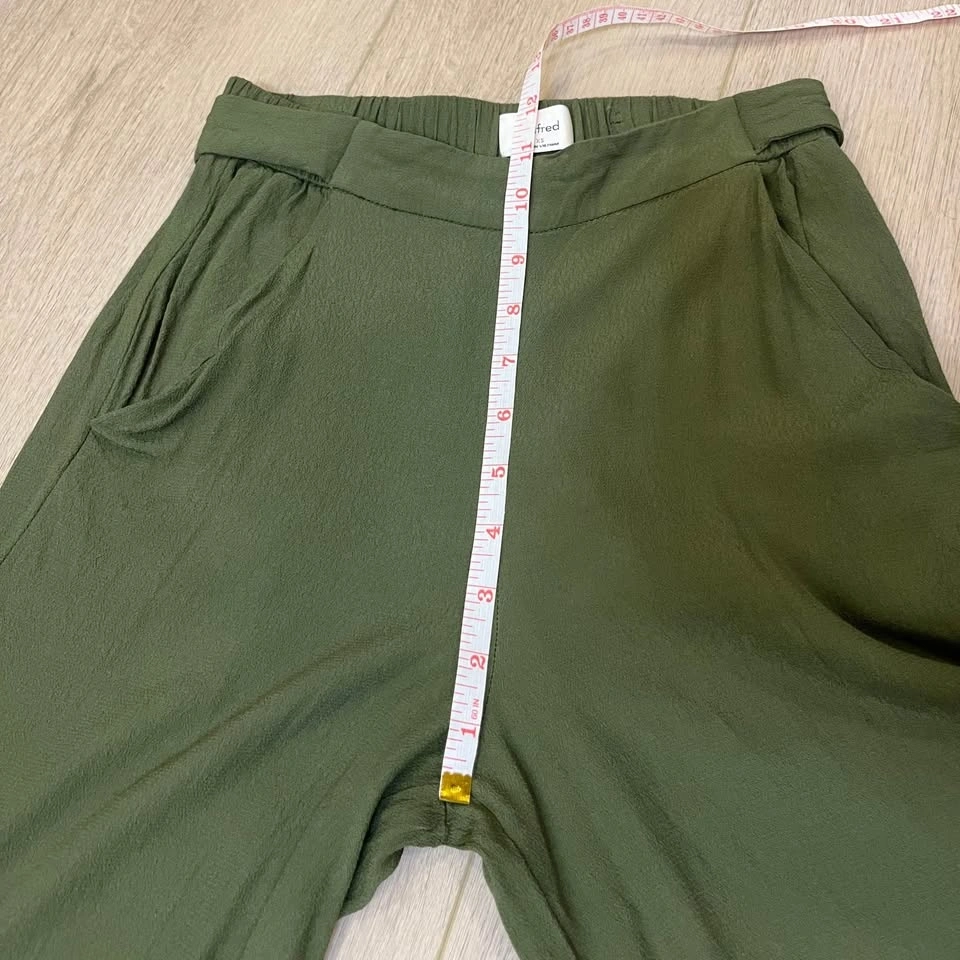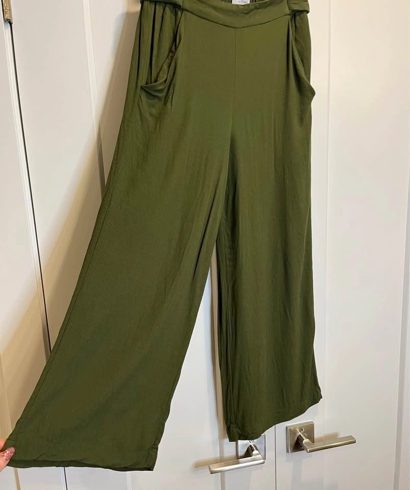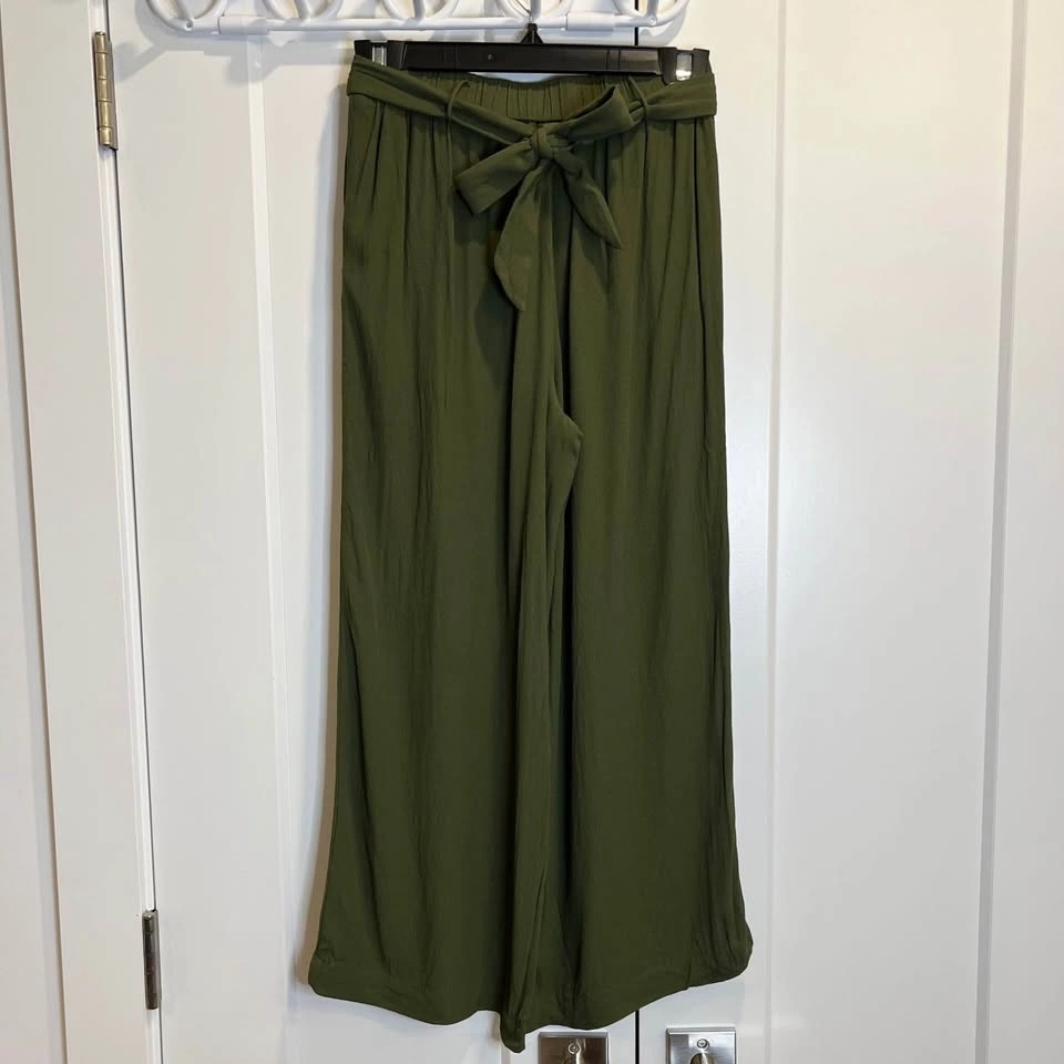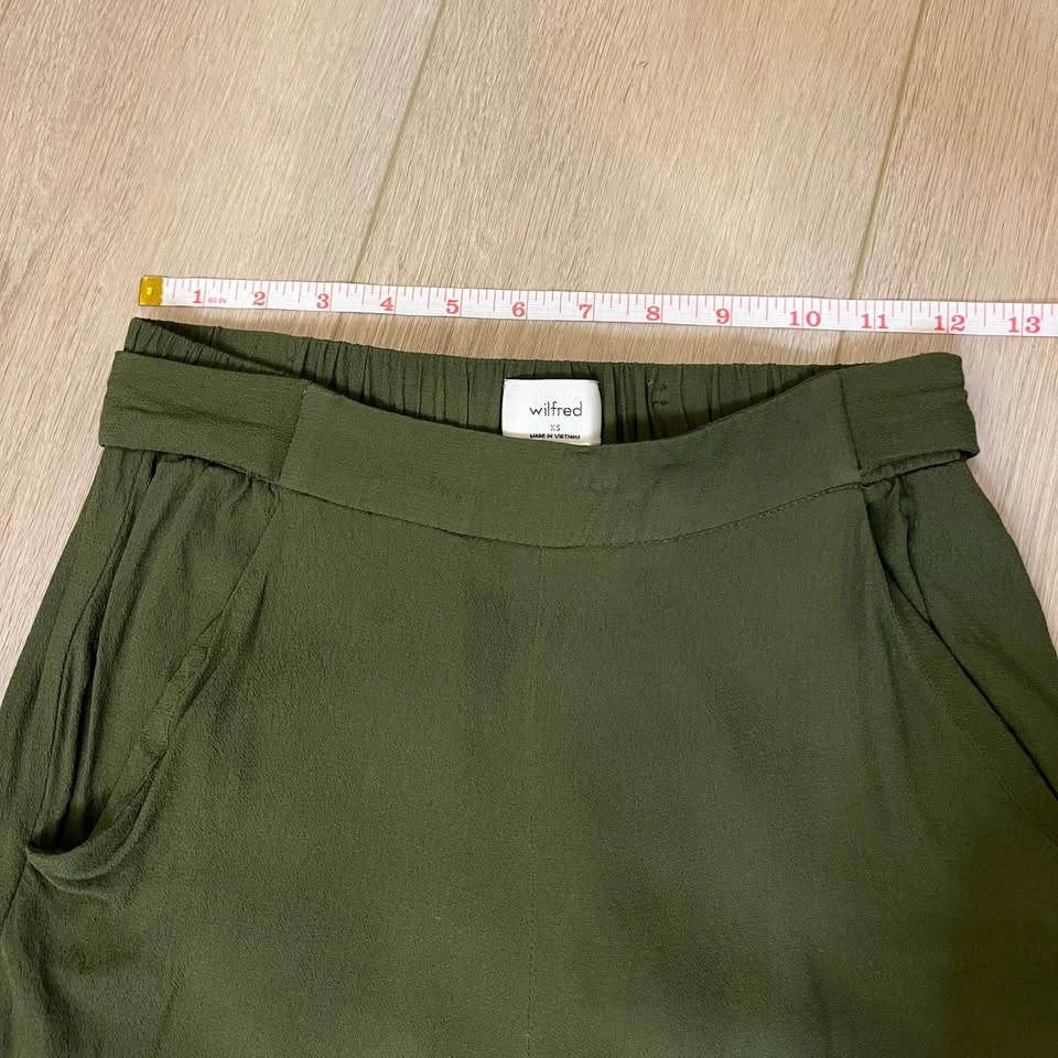Forest/olive green trousers by Wilfred from Aritzia. Elastic waist. Wide leg. 3/4 length (measurements below). Half sash that wraps around sides and ties in back (details shown in pictures).