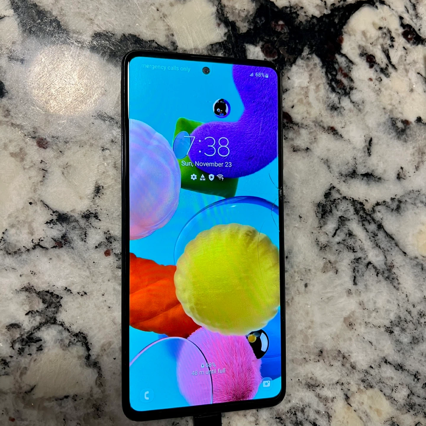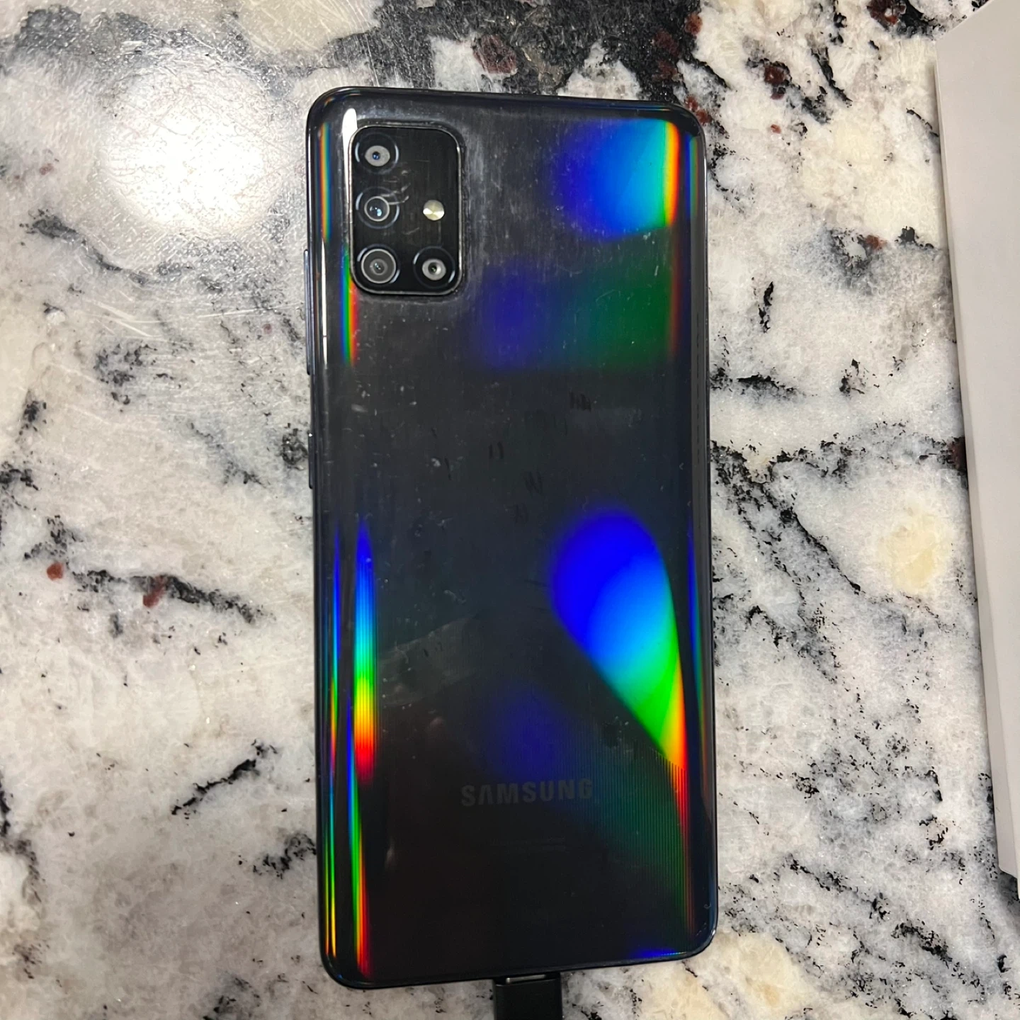 Selling a used Samsung Galaxy A51 in black. It's in good condition and comes with the original box.
