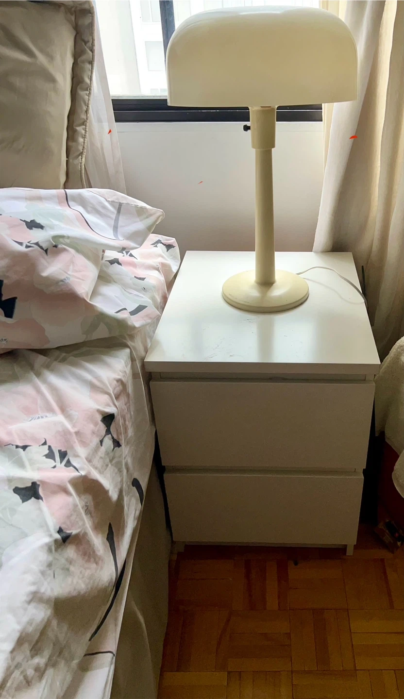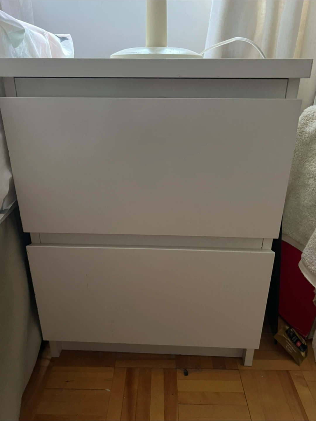 Selling a white IKEA MALM nightstand with two drawers. It's in great condition and perfect for adding some extra storage next to your bed. The clean design fits well with any decor!