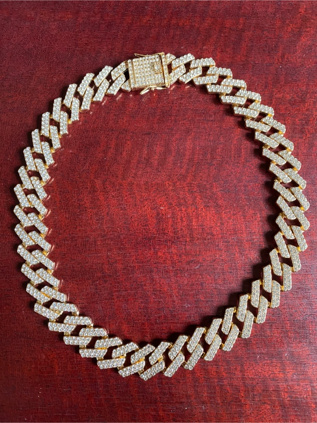 This is a statement Cuban link chain necklace. It's embellished with clear rhinestones and features a gold-tone finish. The clasp is also set with rhinestones.