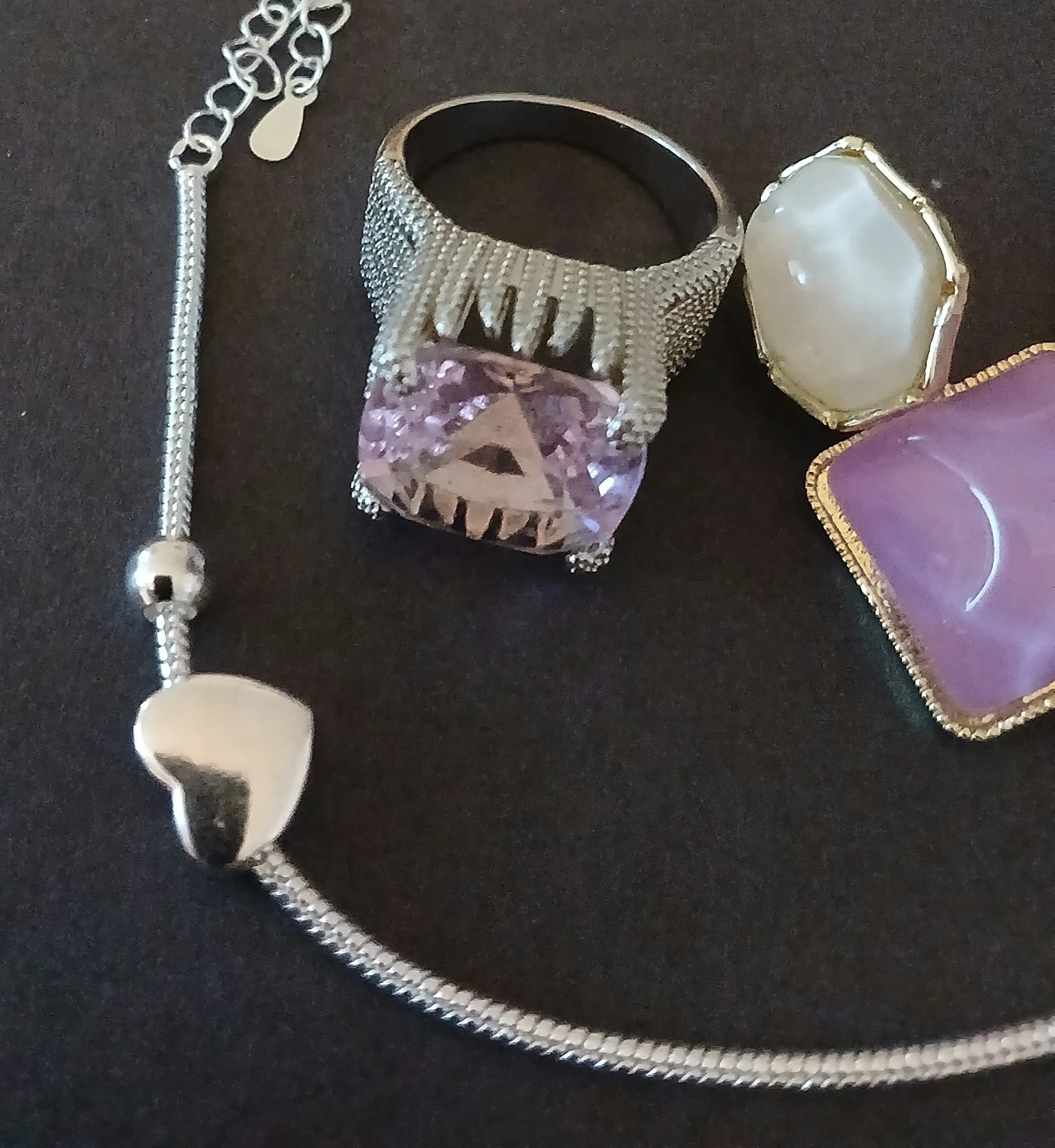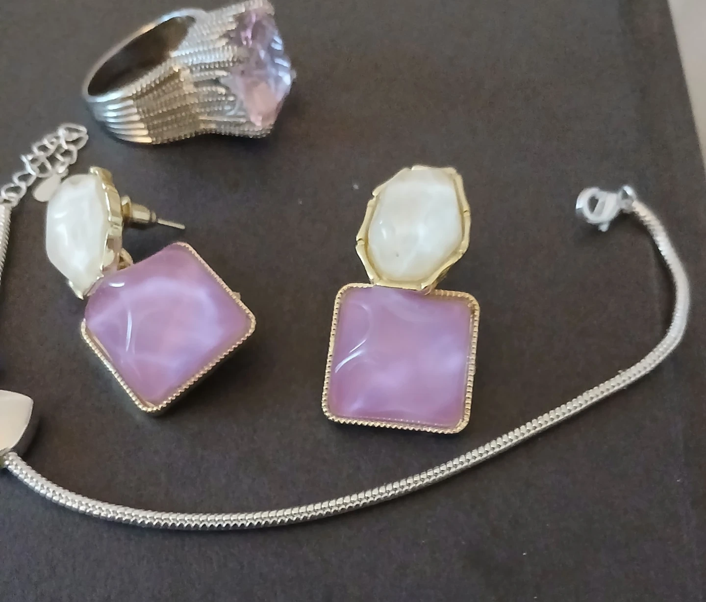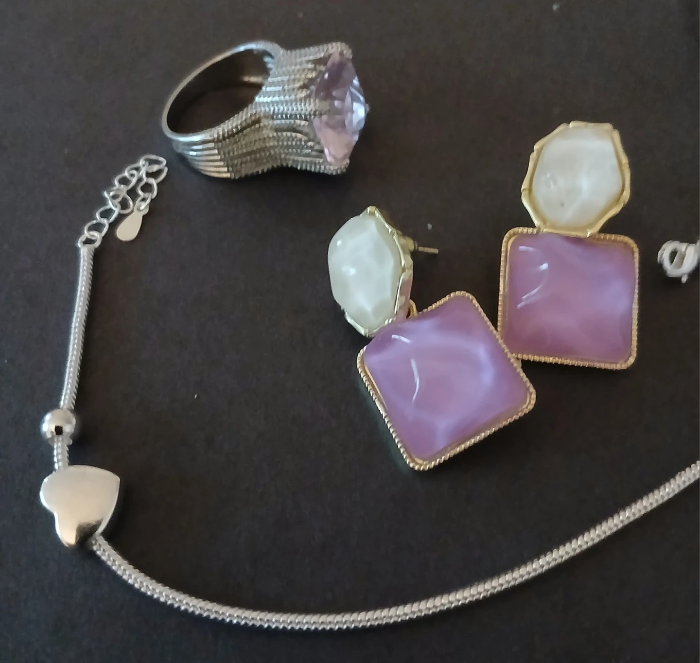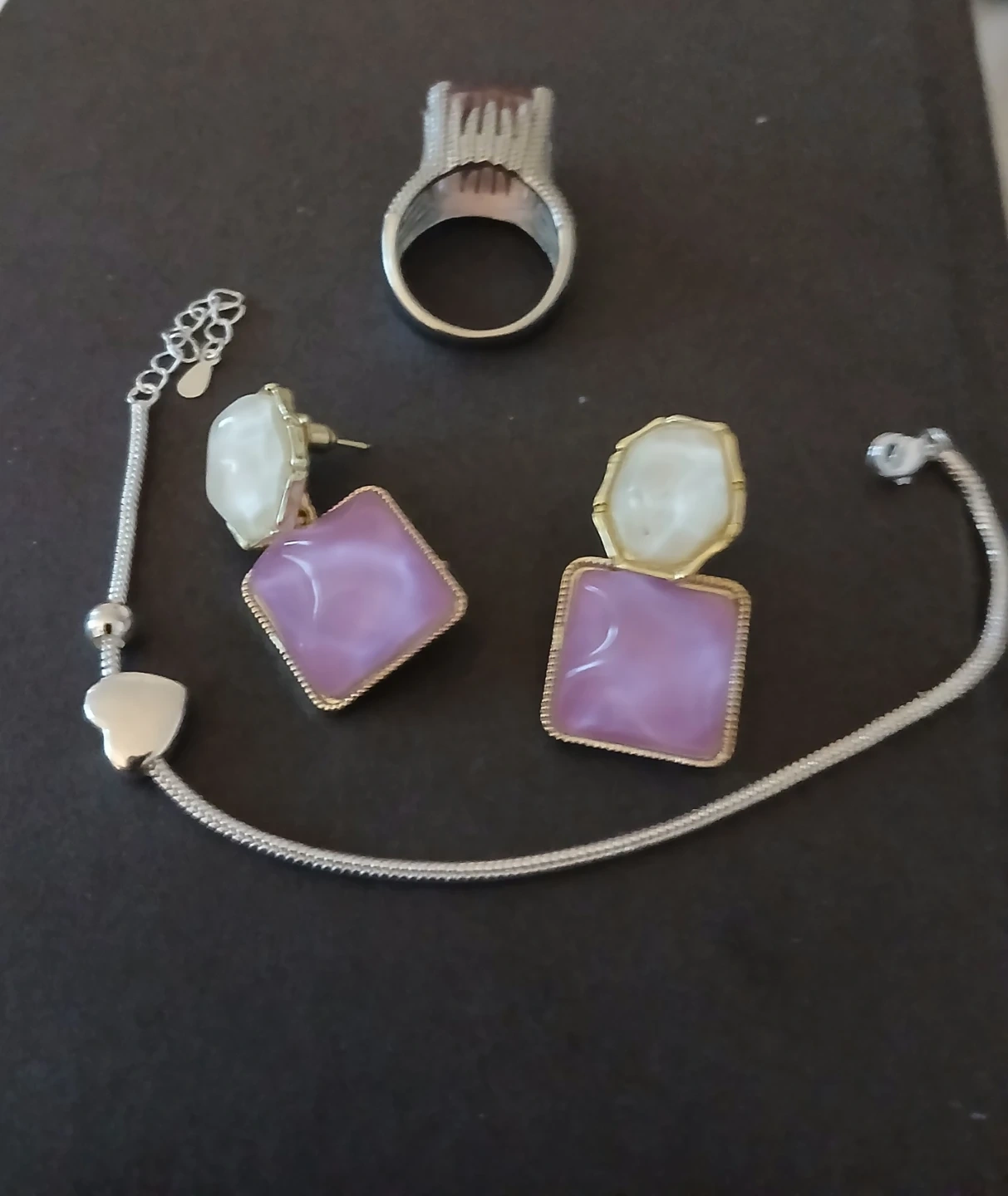 This jewellery set includes a ring with a large pink gemstone and a textured band. It also comes with a pair of earrings featuring white and purple square stones, and a delicate silver-tone bracelet with a heart charm. These pieces are silver-toned metal.