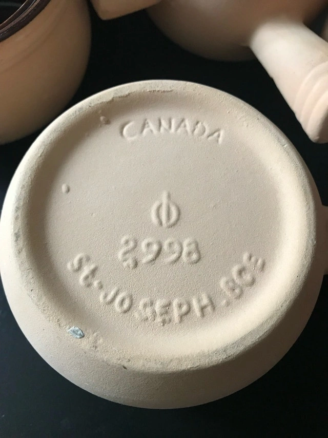 Set of 6 vintage Saint Joseph BCE onion soup bowls, perfect for adding a touch of rustic charm to your kitchen. There is a small chip on one of the bowls (see last photo). The bottoms are stamped 'Canada St-Joseph, BCE, 2998'.